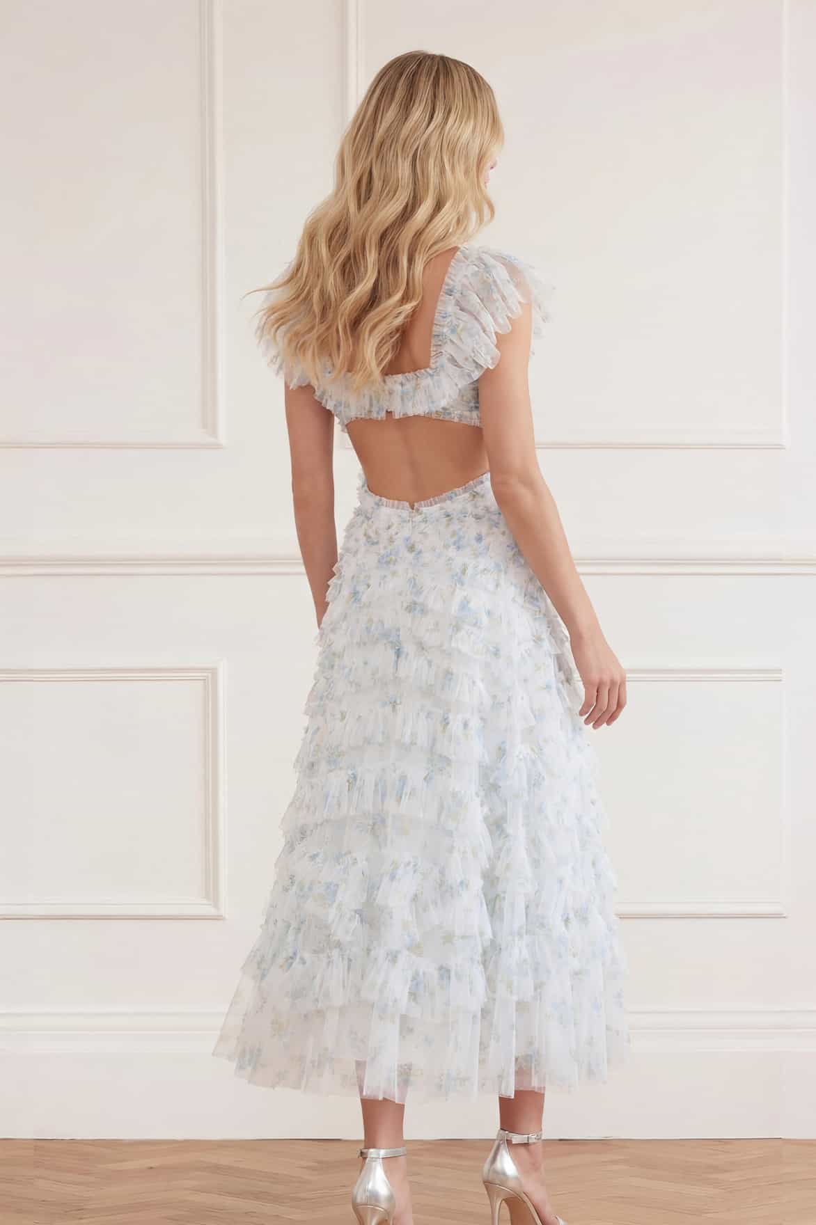 NEW SEASON. The Magnolia Ditsy Lola Backless Ballerina Dress in White/Aqua. A romantic ballerina silhouette reimagined in the Magnolia Ditsy print, inspired by delicate magnolia blooms. Designed with a softly fitted bodice and dramatic open back, the full skirt creates effortless movement.