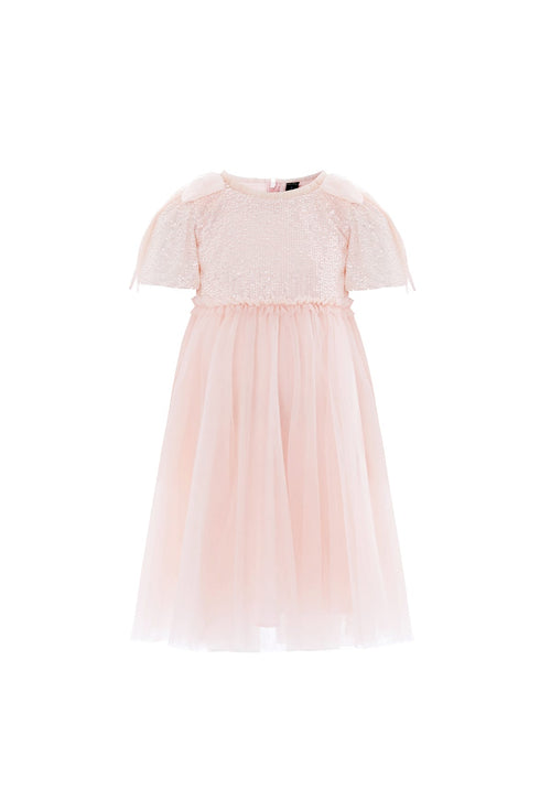 NEW SEASON. The Paloma Bow Kids Dress in Seashell. A charming design crafted in layers of soft tulle. Finished with a beautiful bow and a full skirt, it captures classic Needle & Thread femininity in miniature form.