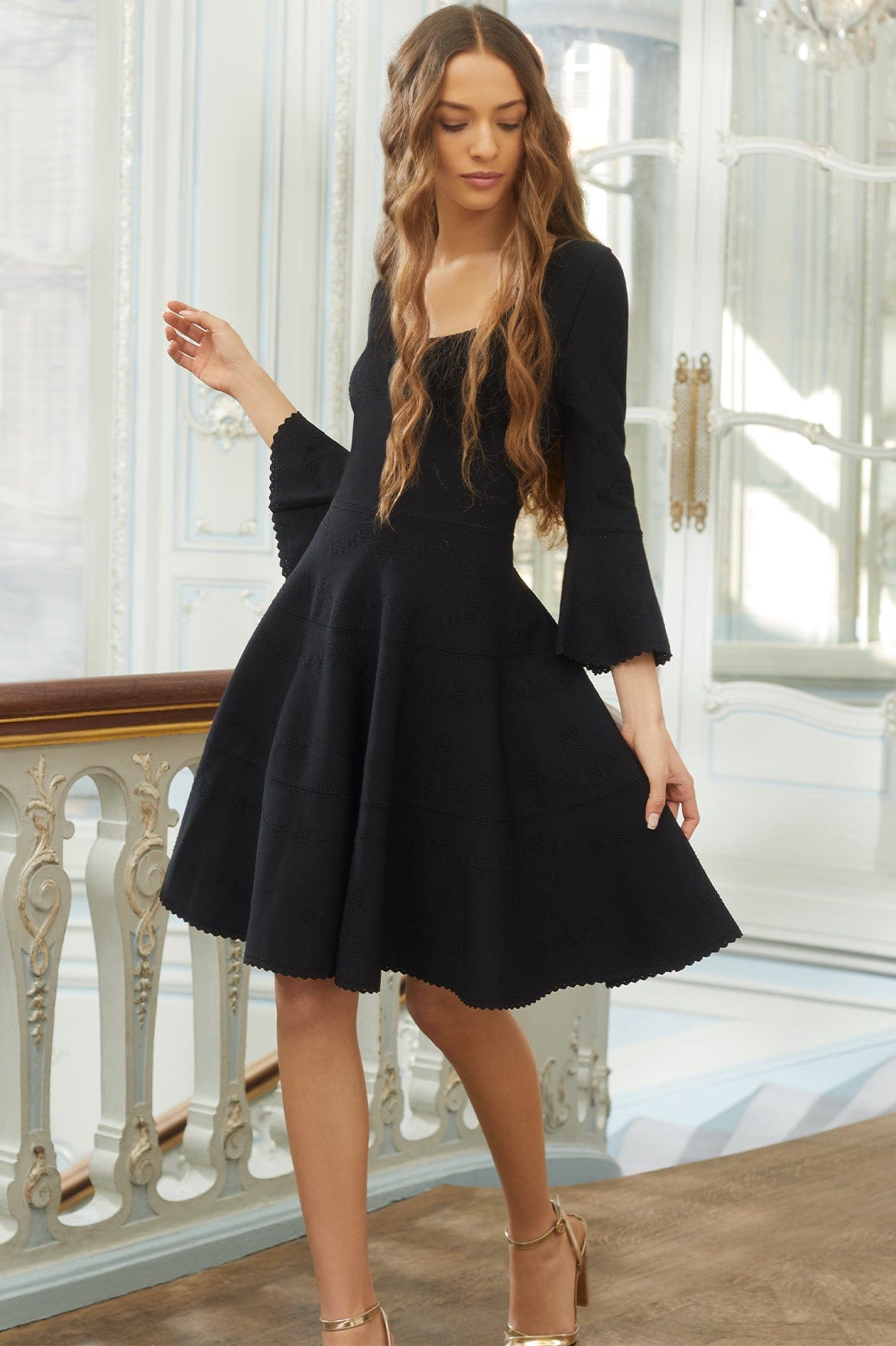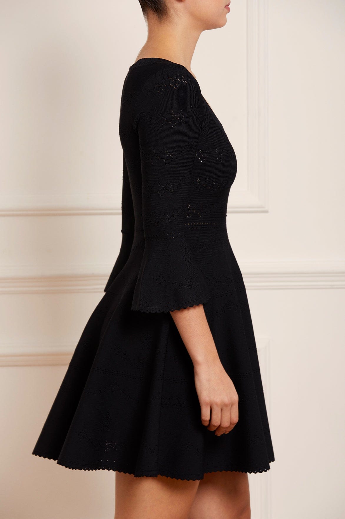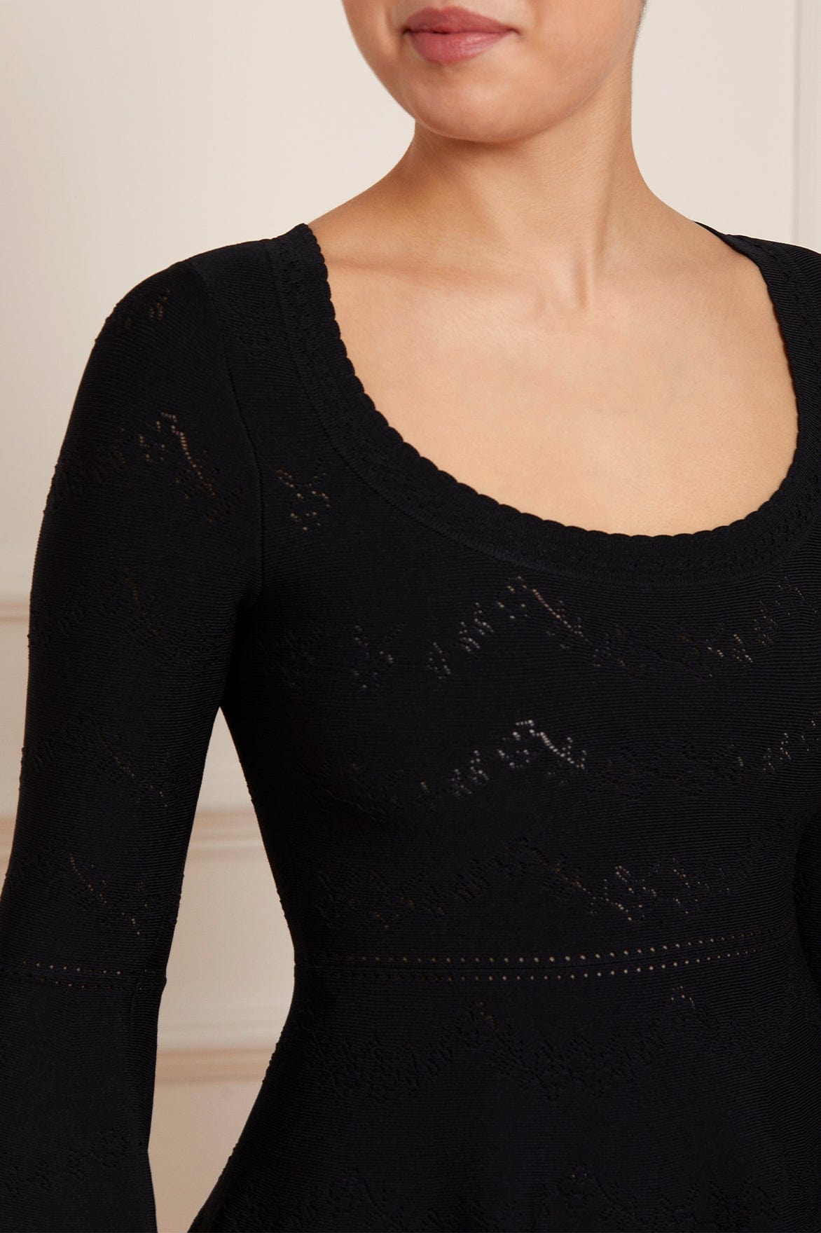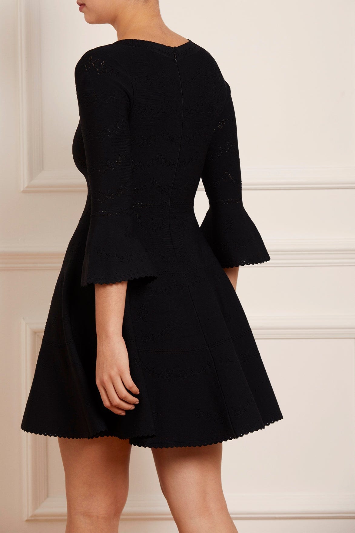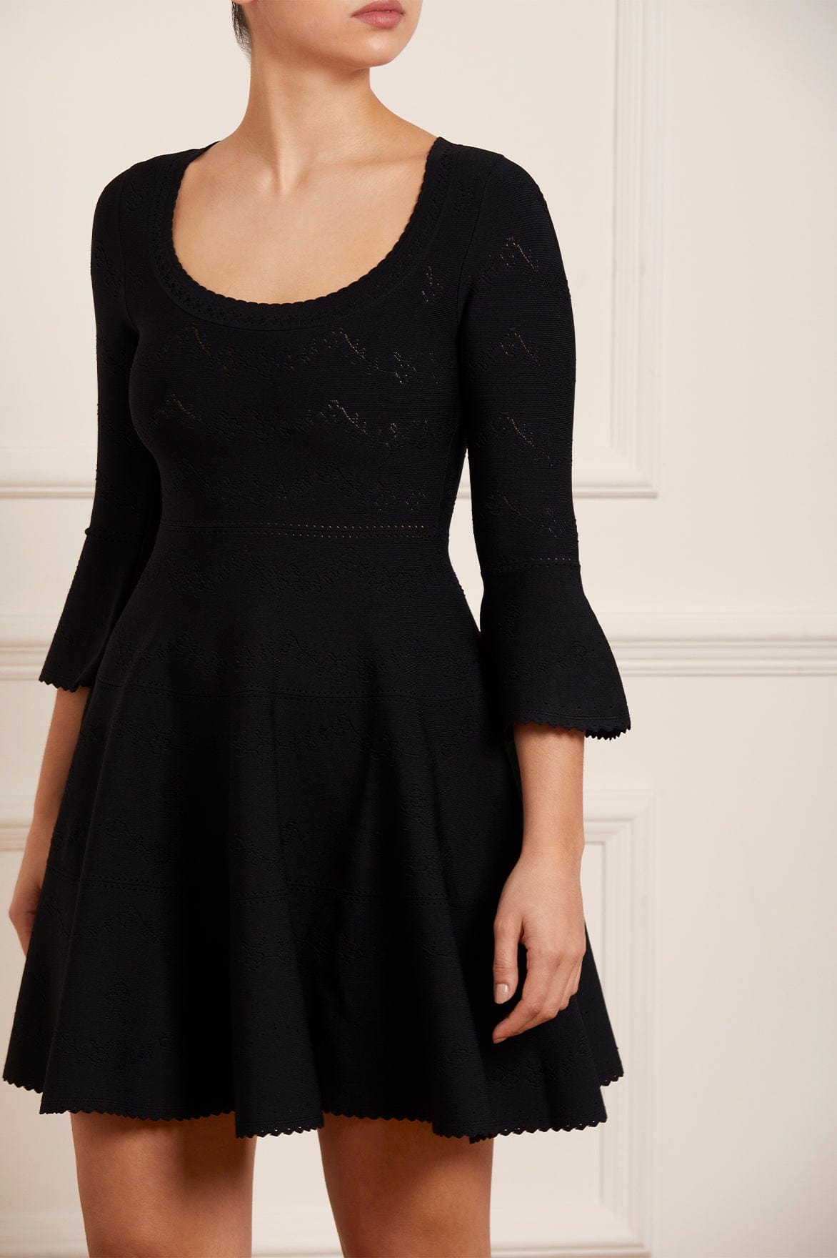 The Pretty Pointelle Knit Scoop Neck Mini Dress in Black. A brand new style for Needle & Thread. This knitted dress is inspired by vintage ditsy florals and lace. Beautifully designed with all-over pretty pointelle stitch, delicate florals and scallop details. This dress has a fitted stretch bodice with a soft, feminine neckline, fluted cuffs and signature Needle & Thread detailing. A truly flattering piece.