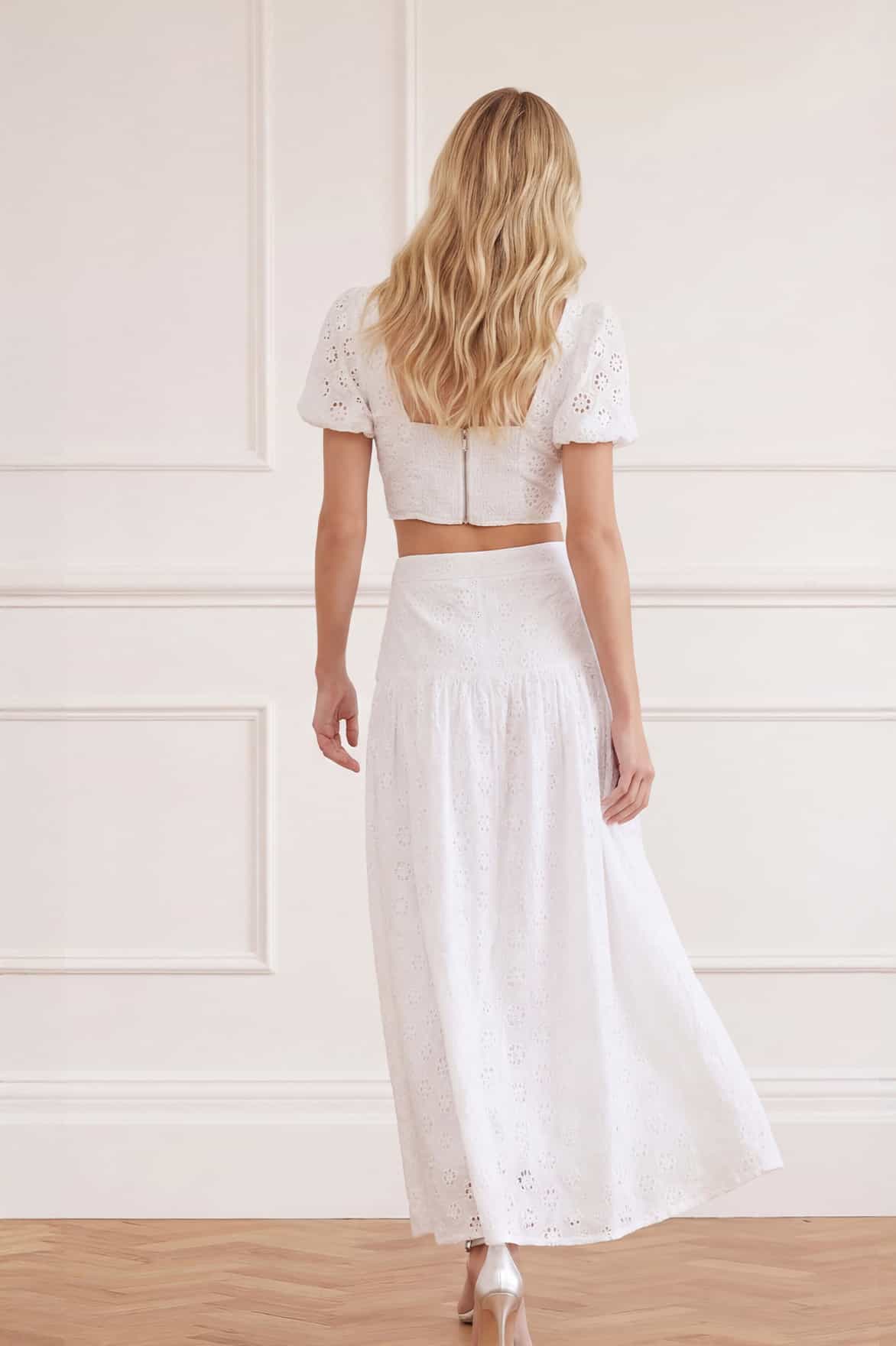 NEW SEASON. The Romilly Cotton Broderie Ankle Skirt in Optic White. This ankle-length skirt is crafted from delicate cotton broderie embroidered with trailing daisy motifs. The flowing silhouette creates graceful movement and versatile styling. The perfect pairing with our Romilly cotton broderie top for elegant summer occasion wear.