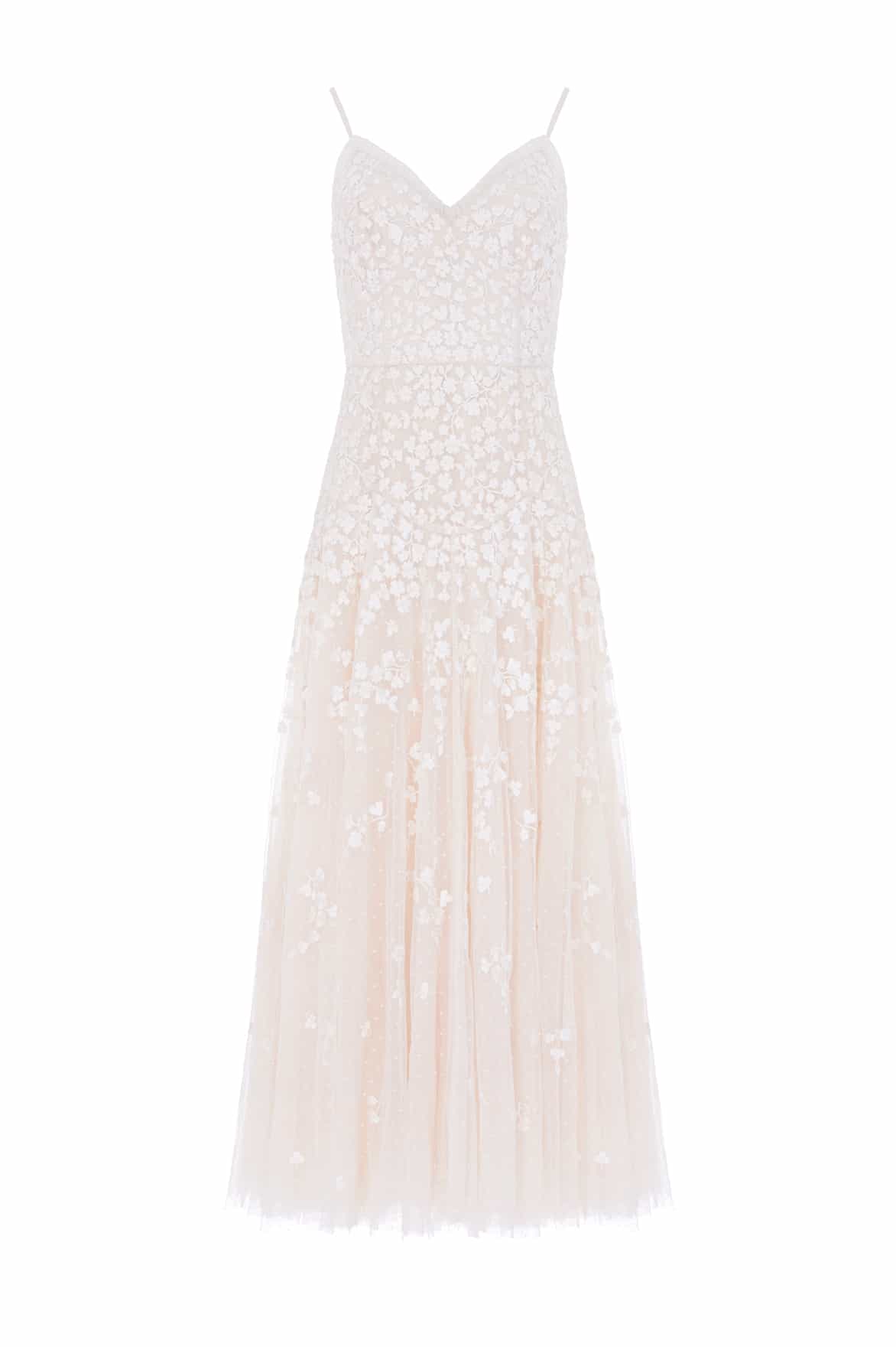 NEW SEASON. The Scatter Blossom Cami Ankle Gown in Cream. Decorated with whimsical tonal embroidery and dainty florals. Crafted from delicate tulle with a softly flared skirt, this romantic gown embodies poetic elegance.
