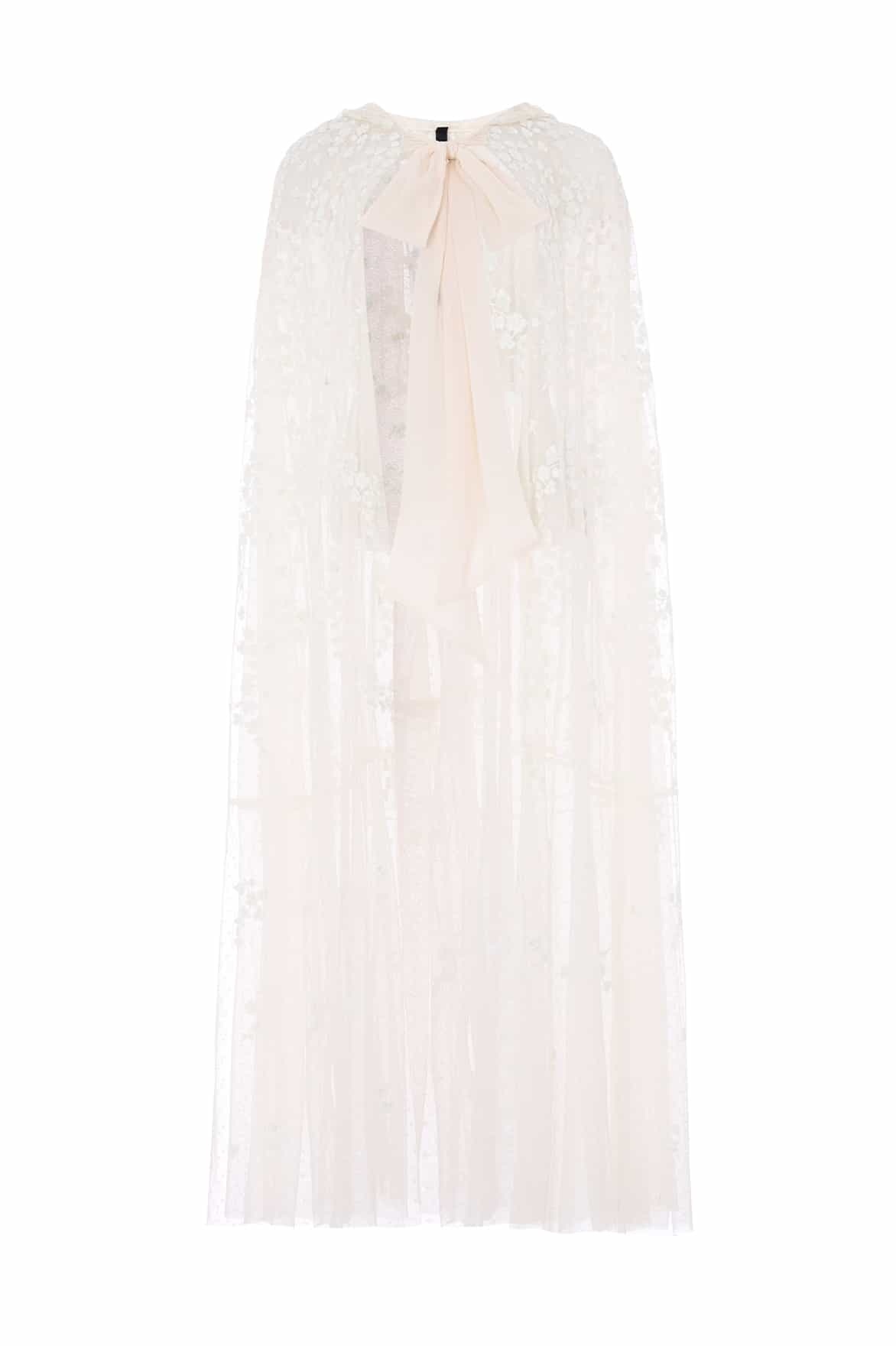 NEW SEASON | NEEDLE & THREAD EXCLUSIVE. The Scatter Blossom Hooded Long Cape in Cream. An enchanting piece adorned with delicate ditsy embroidery. Designed with a softly draped hood and floor-length silhouette, this exclusive cape adds ethereal charm to any occasion look.