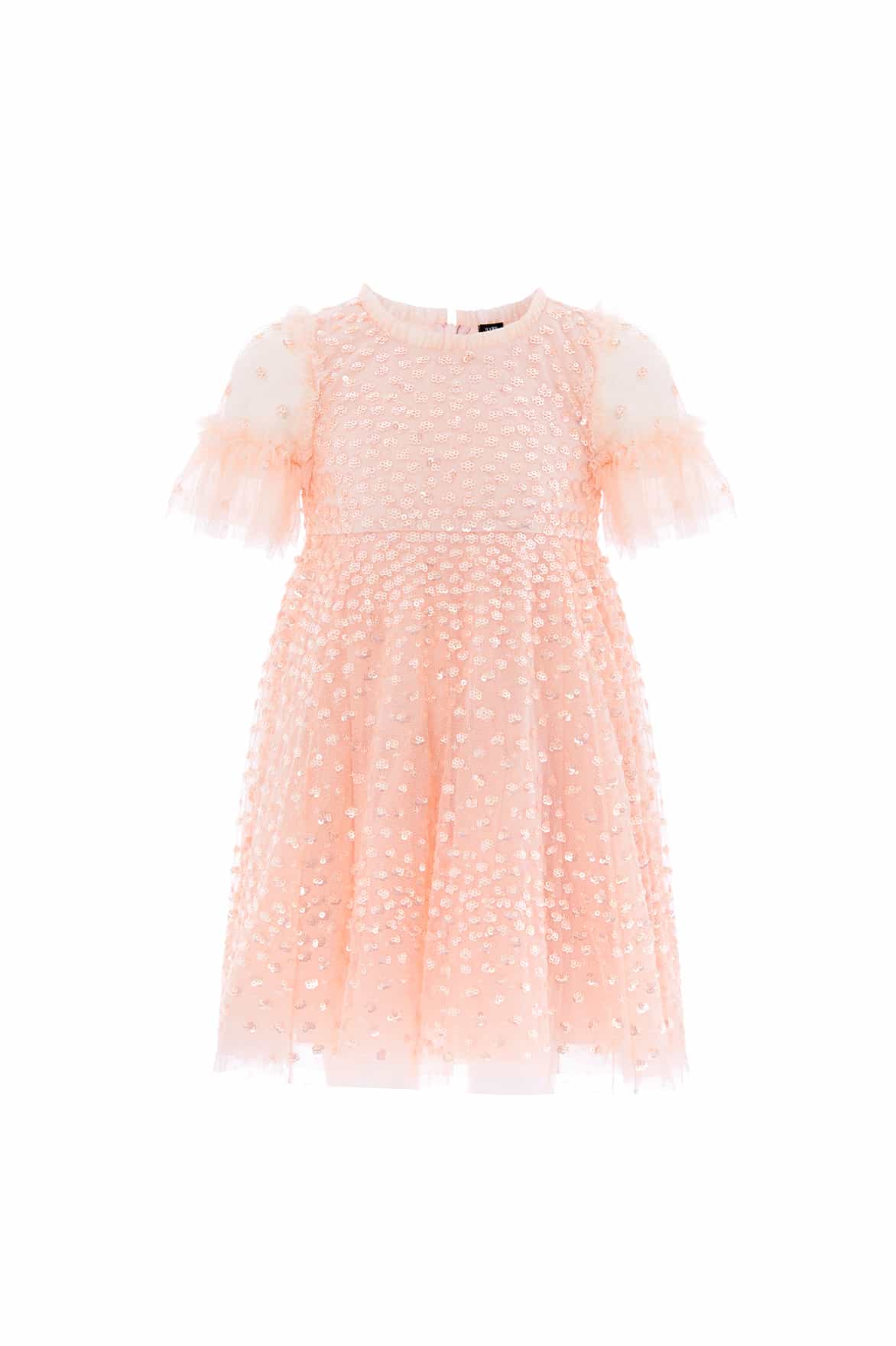 NEW SEASON. The Scatter Dot Kids Dress in Apricot features shimmering dot motifs that fade towards the hem for a glittering effect. Crafted with high-shine sequins and delicate Needle & Thread tulle frills at the neckline, shoulders, and waist, it offers a frothy, romantic look. Crafted with fluted sleeves with soft frills and sparkling dots complement the voluminous tulle skirt, perfect for twirling.