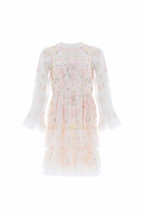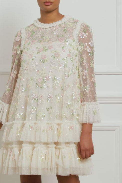 The Sequin Bloom Gloss Mini Dress in Cream. This mini dress is decorated with floral motifs that cascade down the dress in shimmering sequins. Designed with a flattering silhouette in a loose shape, creating a romantic, effortless style. This dress has a gathered panel at the hem and cuffs for signature Needle & Thread detailing. Make this dress your new wardrobe favourite.