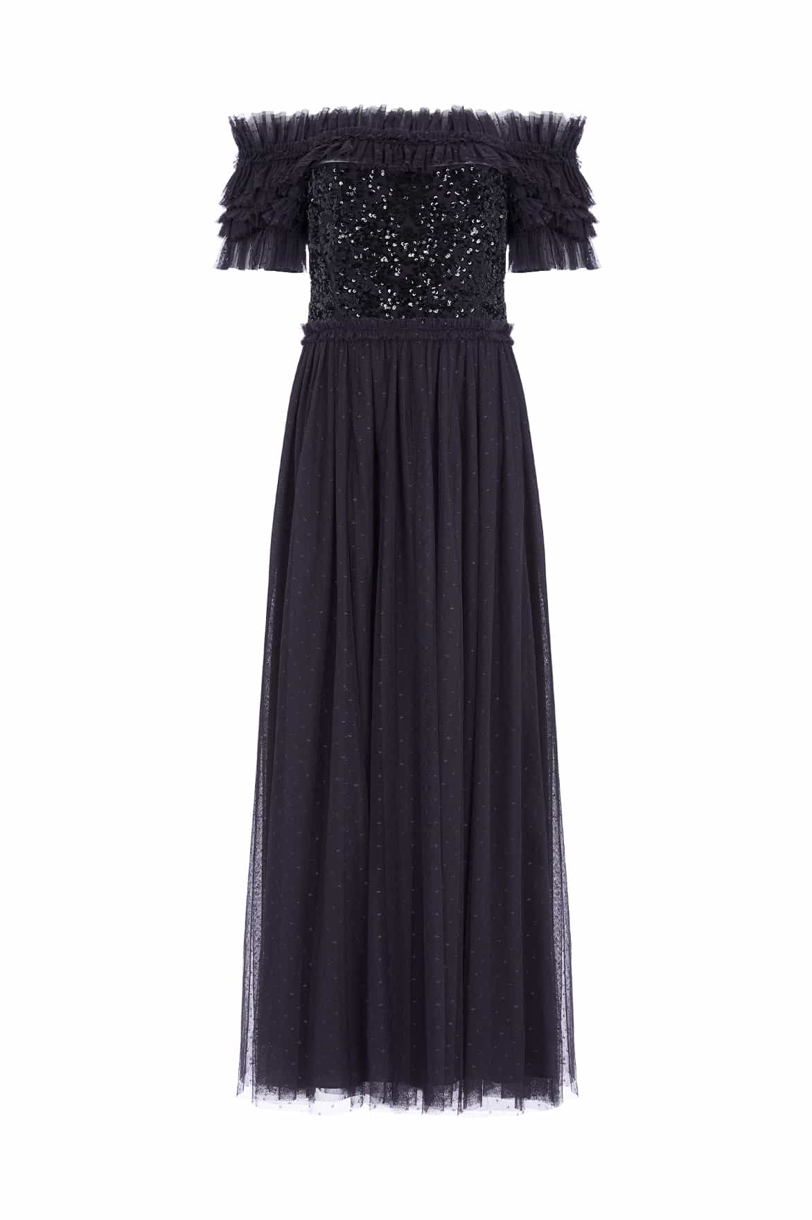 The Sequin Wreath Bodice Off-Shoulder Ankle Gown in Graphite. This beautiful gown is crafted with an iconic off-the-shoulder design. Adorned with layers of delicate ruffles, along with an elasticated panel for comfort and hold. The bodice is beautifully decorated with shimmering sequins inspired by a vintage lace curtain. Designed with a romantic layered tulle skirt for signature Needle & Thread styling. A perfect gown for a special occasion.