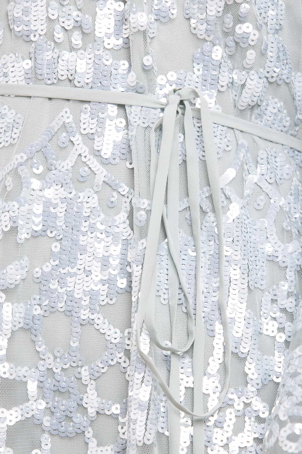 The Snowdrop Mini Dress in French Blue. A heritage Needle & Thread design, this timeless dress features shimmering sequin artwork inspired by antique tablecloths from the early 1900s. Intricate floral borders and lattice patterns create a striking, heirloom-like embellishment. Designed for effortless elegance, the dress has a relaxed fit with a slim crepe waist tie for versatile styling. Crafted with romantic fluted sleeves, a softly tiered hem, and signature frill detailing at the neckline complete the look.