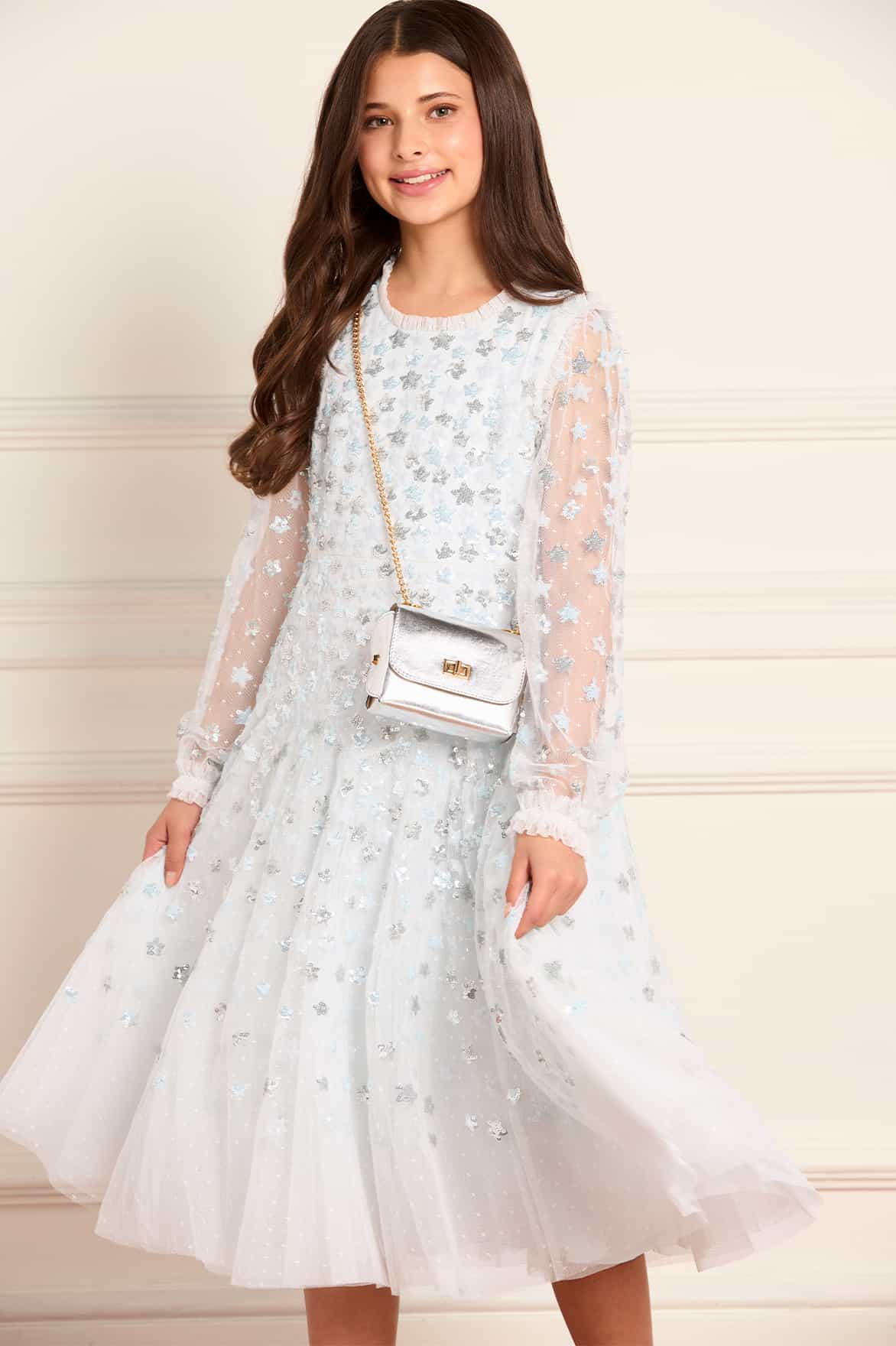 NEW SEASON. The Starry Nights Kids Dress in Ice Blue. Features twinkling star sequins cascading across soft tulle. With a full, gathered skirt and a gentle sparkle, it’s made for moments that feel truly magical. This dress pairs beautifully with the Starry Nights Round Neck Gown from the womenswear line for a timeless coordinated look.
