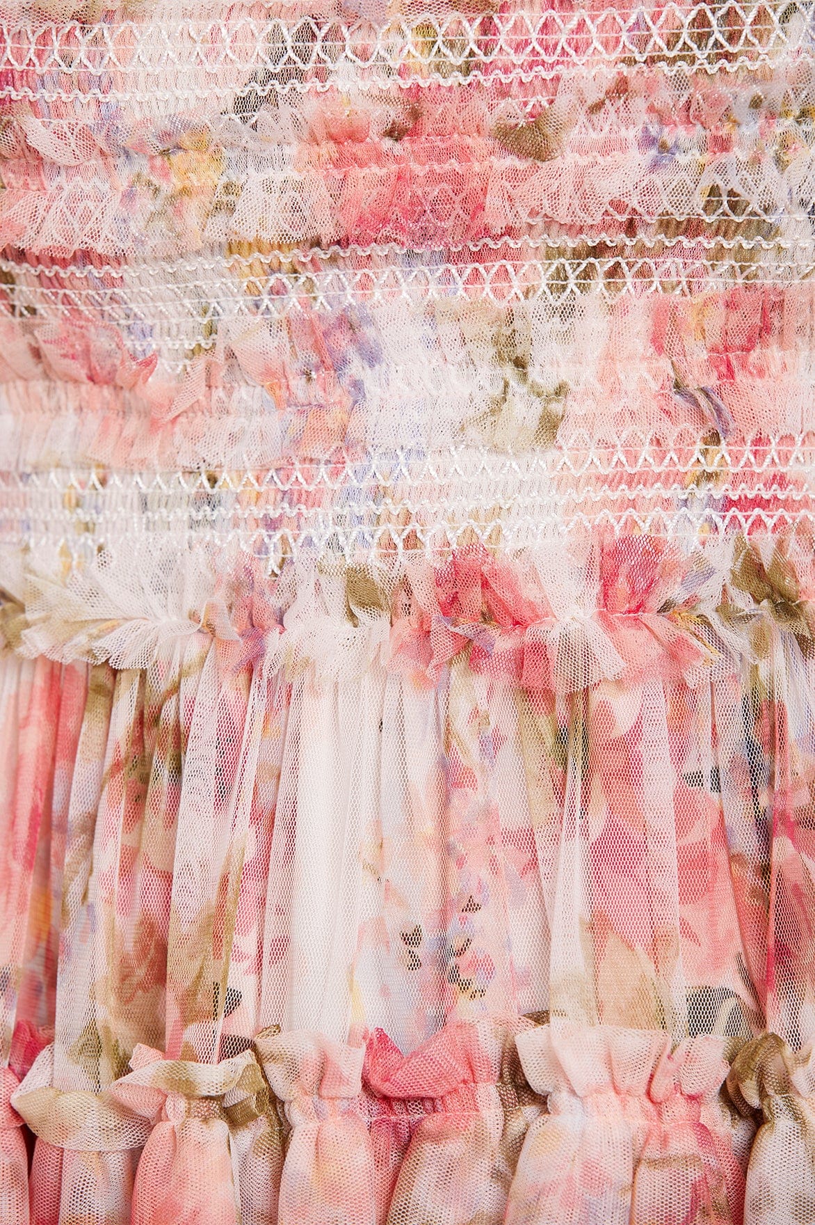 - Floral printed tulle decorated with tulle ruffles