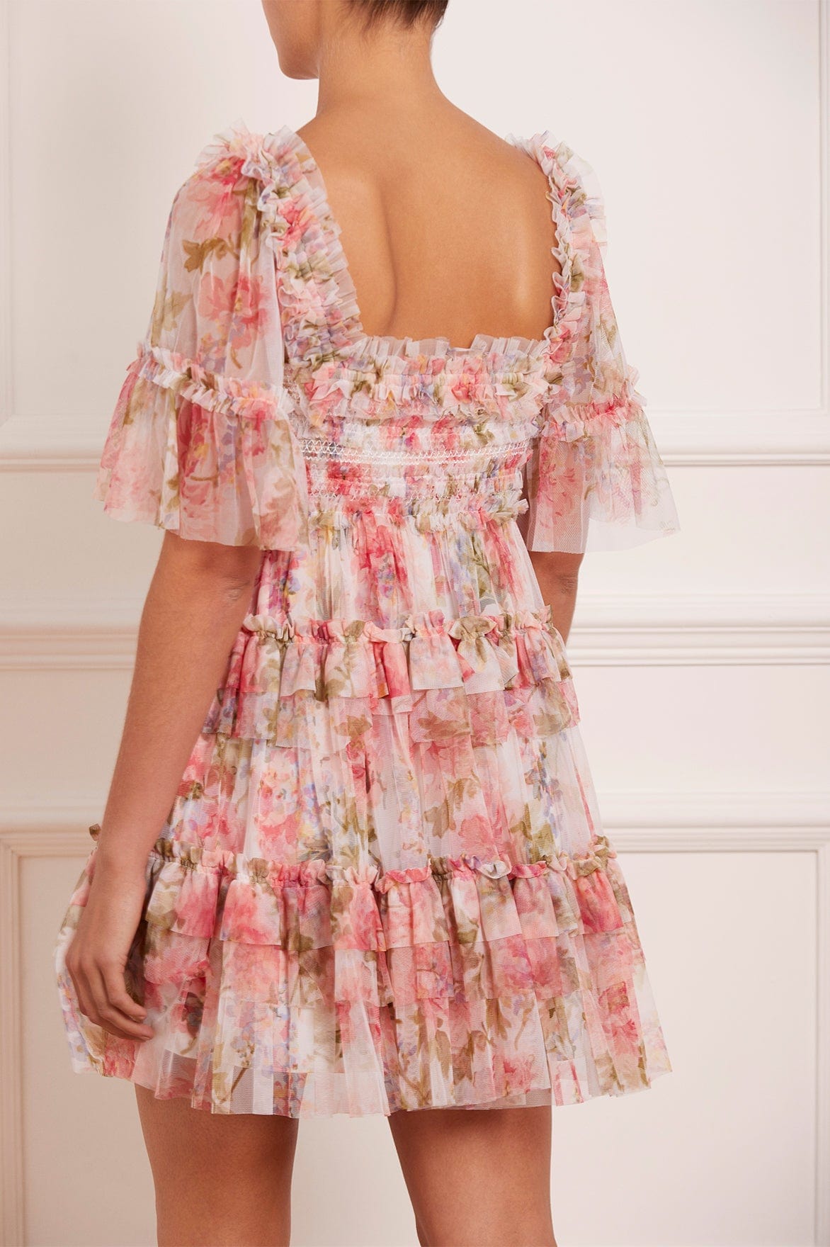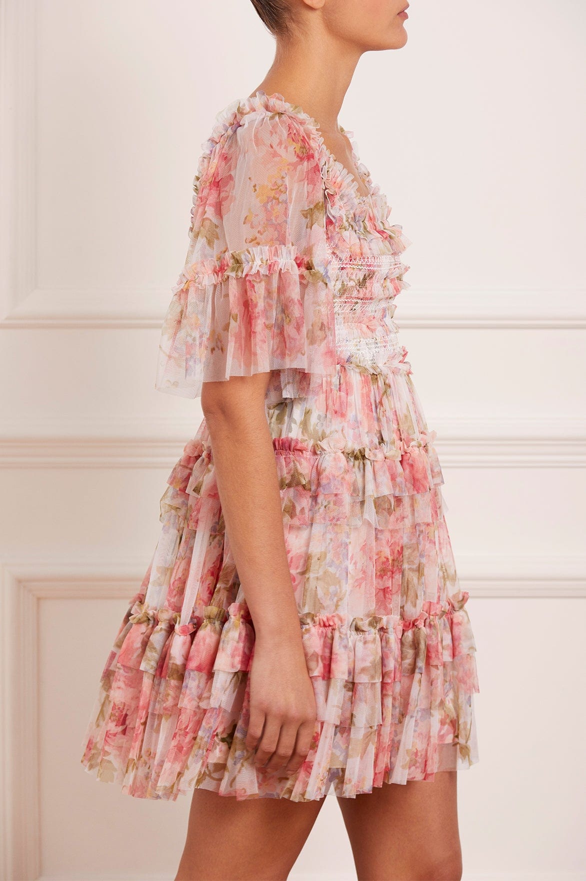 NEW SEASON | NEEDLE & THREAD EXCLUSIVE. The Summer Song Peaches Smocked Micro Mini Dress in Moonshine / Pink. This statement mini dress is beautifully printed with a romantic, floral artwork in sunset colours of dusk. Designed with playful layered tiers and frills, plus a full skirt for romantic movement. This mini features an elasticated smocked waist for comfort and pretty detailing and is beautifully crafted with short sleeves, tulle ruffles and a 'x' kiss motif throughout. The perfect dress to take you from day to night.