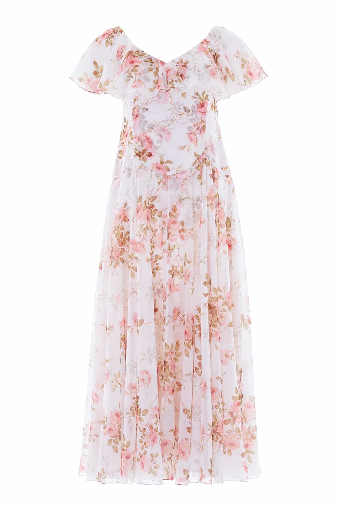 NEW SEASON | NEEDLE & THREAD EXCLUSIVE. The Summer's Rose Georgette Ankle Gown in White. Adorned with the delicate Summer’s Rose floral print, this ankle-length gown evokes the warmth of fading summer light. Crafted in fluid georgette, the silhouette drapes effortlessly for graceful movement.
