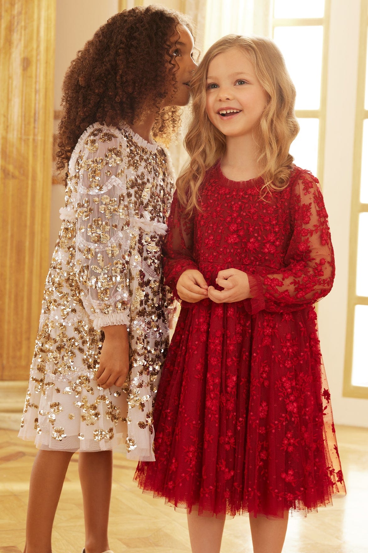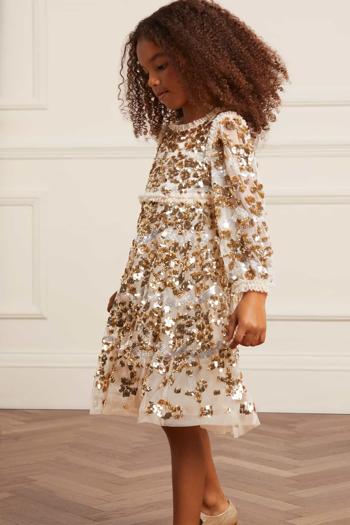 The Alicia Sequin KIDS Dress in Champagne / Gold. This KIDS style features signature Needle & Thread details. Beautifully designed with high-impact, lustrous sequins creating an all-over shimmering effect. This KIDS dress has intricate artwork featuring floral and scallop shape motifs cascading down the dress. Let your little one shine at her next event.