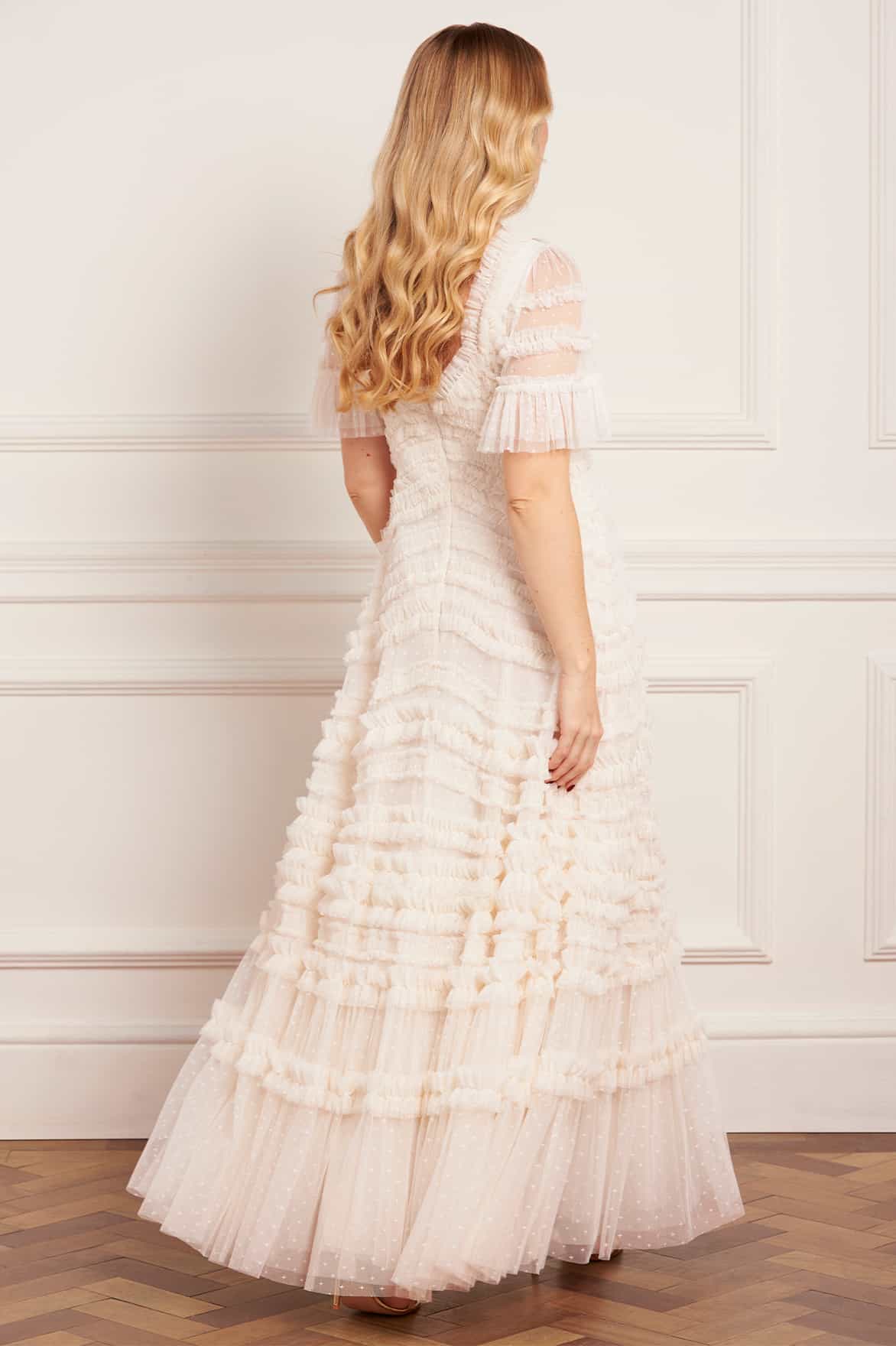 NEW SEASON. The Amara Ruffle Gown in Cream. Crafted from layers of soft tulle, beautifully engineered with cascading ruffles that create graceful movement. Featuring frothy fluted sleeves and a sweeping hemline, this romantic gown captures the spirit of ethereal femininity.