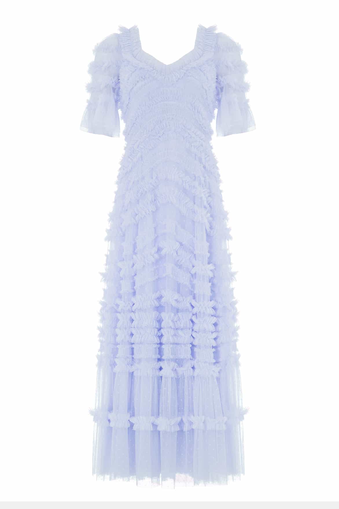 NEW SEASON. The Amara Ruffle Gown in Skylight. A true statement of romantic artistry. Crafted from layers of frothy tulle, the gown features curved bands of ruffles that flow gracefully across the body and cascade into a voluminous skirt, creating dramatic movement and charm.