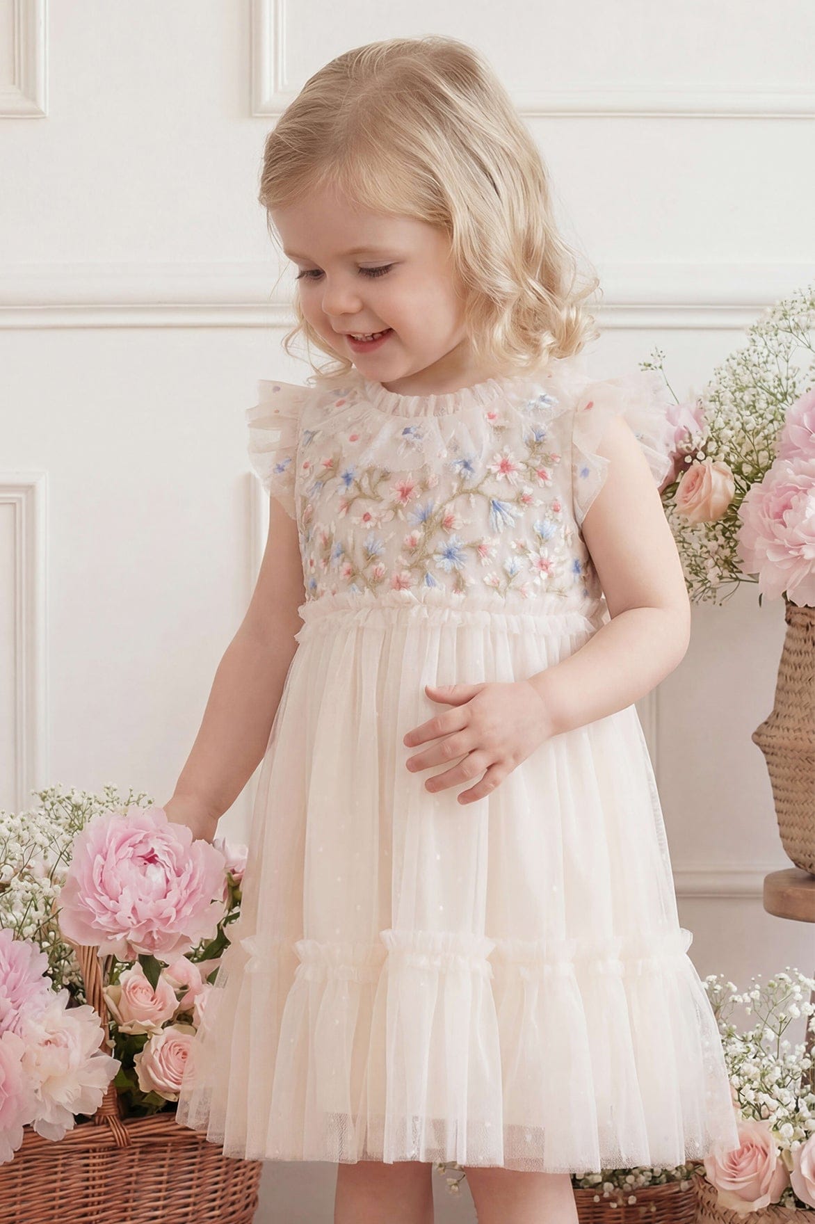 The Antoinettes Floral Bodice Baby Dress in Cream. A dreamy piece inspired by the romance of Versailles. Crafted with delicate multicoloured floral embroidery scattered across a cloud of tulle, signature frills at the neckline and waist add a touch of enchantment. Designed with layered tulle sleeves and a gently ruffled skirt, it creates a floaty, ethereal silhouette. Finished with a breathable cotton voile lining and frilled bloomers for comfort. This dress is perfect for every magical moment.