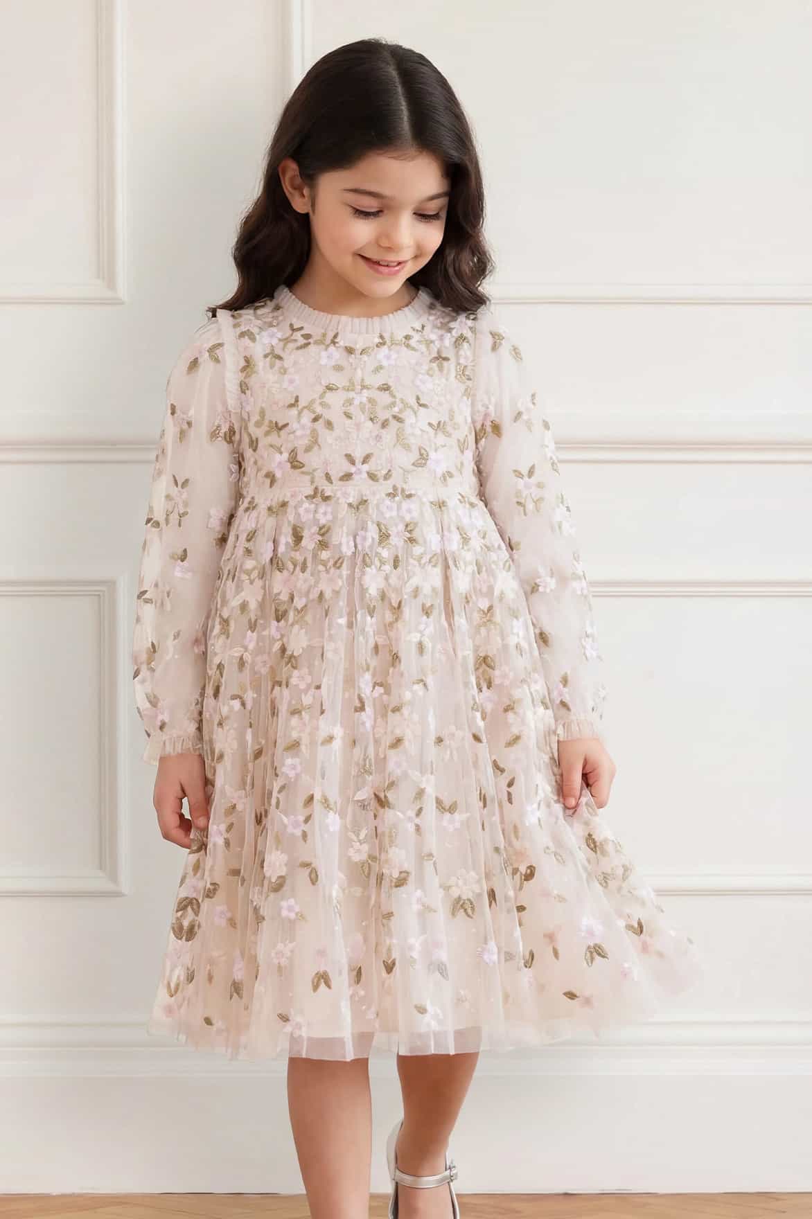 NEW SEASON. The Camellia Ditsy Long Sleeve Kids Dress in Cream/Multi. This long sleeve kids dress features charming ditsy florals arranged across a softly structured silhouette. The full skirt enhances movement while offering comfort and ease of wear. A timeless flower girl option, designed to complement the Camellia Ditsy Ankle Gown.