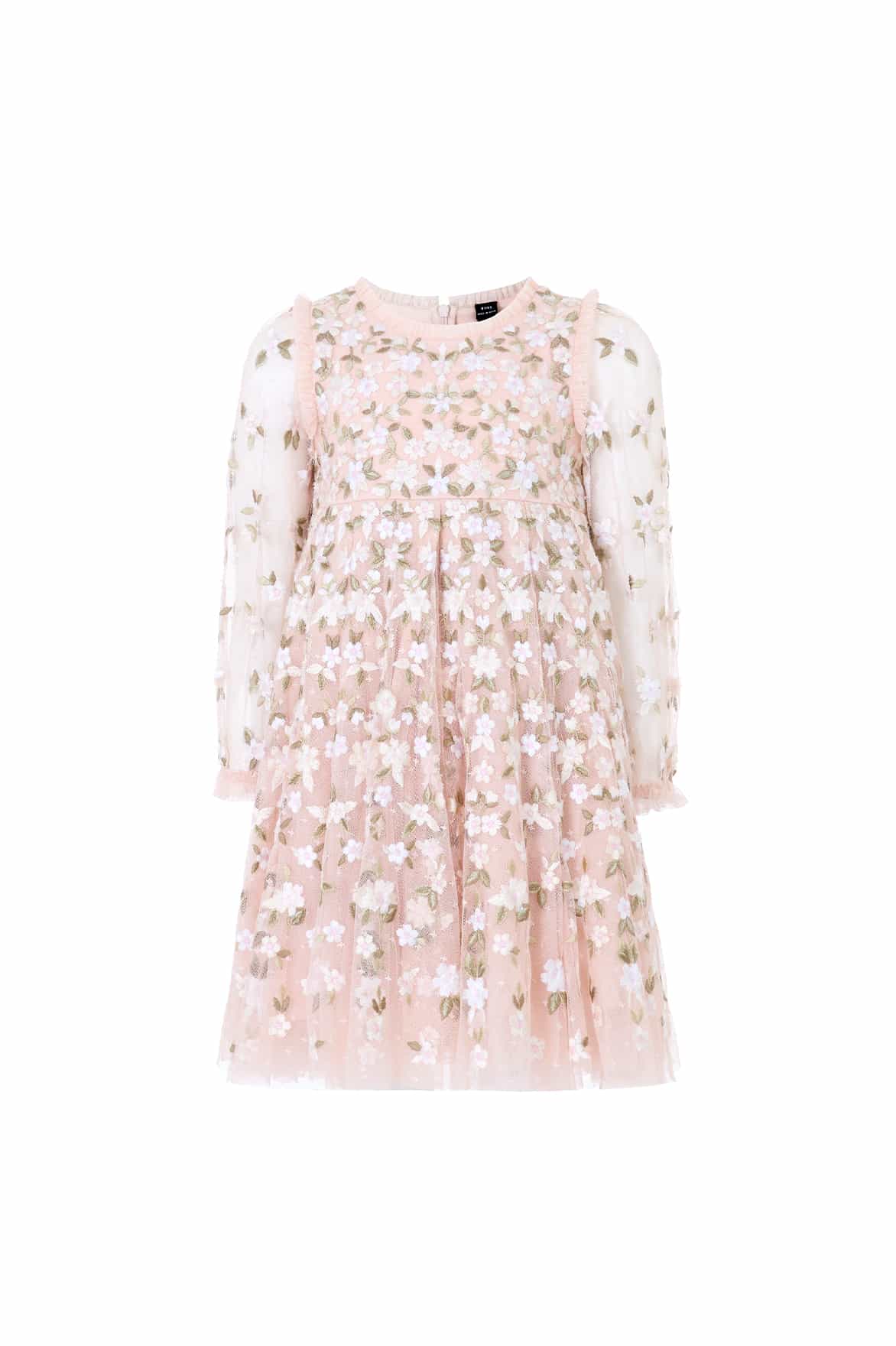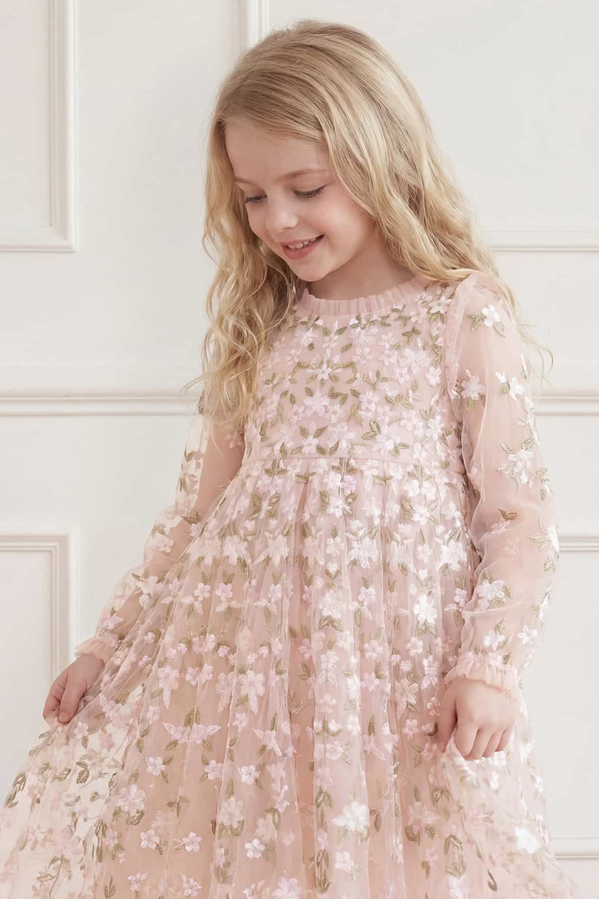 NEW SEASON | NEEDLE & THREAD EXCLUSIVE. The Camellia Ditsy Long Sleeve Kids Dress in Opal/Multi. Inspired by trailing garden florals, this long sleeve silhouette combines delicate print with a classic full skirt for elegant movement. The shape feels both special and easy to wear. A charming choice for a special celebration, perfectly complements the Camellia Ditsy Ankle Gown.