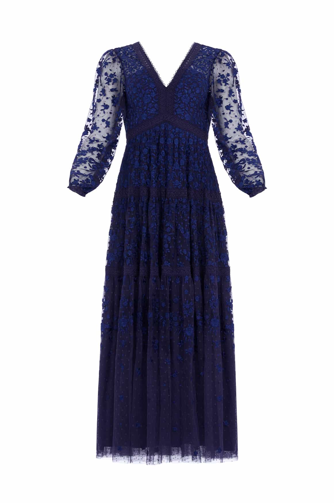 The Celestia Ribbon Ankle Gown in Navy. This gown has been intricately designed with rich embroidery inspired by vintage lace, featuring delicate floral motifs and ribbon bows throughout. Crafted with pretty lace trims for signature Needle & Thread detailing, and delicately constructed with a textured tulle fabric base. Featuring a V-shaped neckline and a new, ultra-flattering silhouette. Make the ultimate statement in the Celestia.