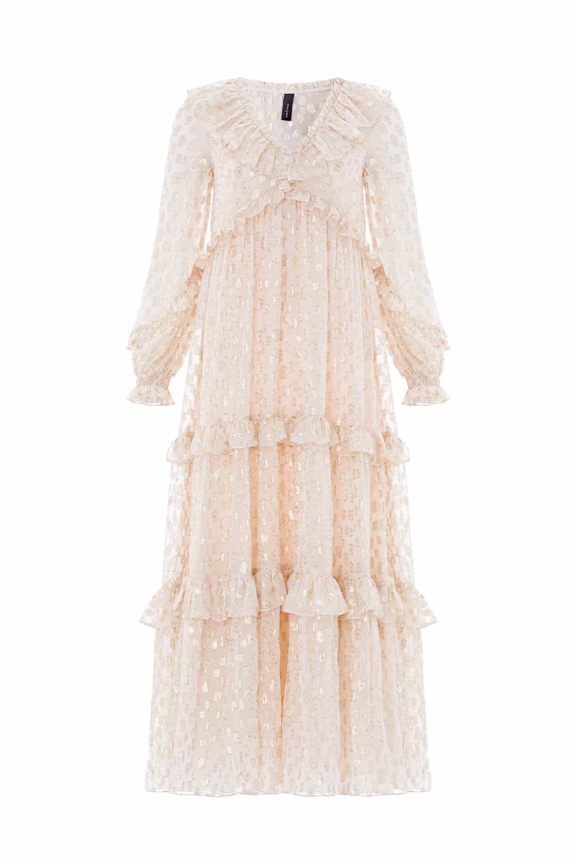 The Cherie Lurex Ankle Gown in Opal. A subtly sparkling style, crafted from fluid georgette with metallic lurex thread. With a softly gathered silhouette and romantic long sleeves, this gown glimmers gently as it catches the light. An elegant option for unforgettable moments.