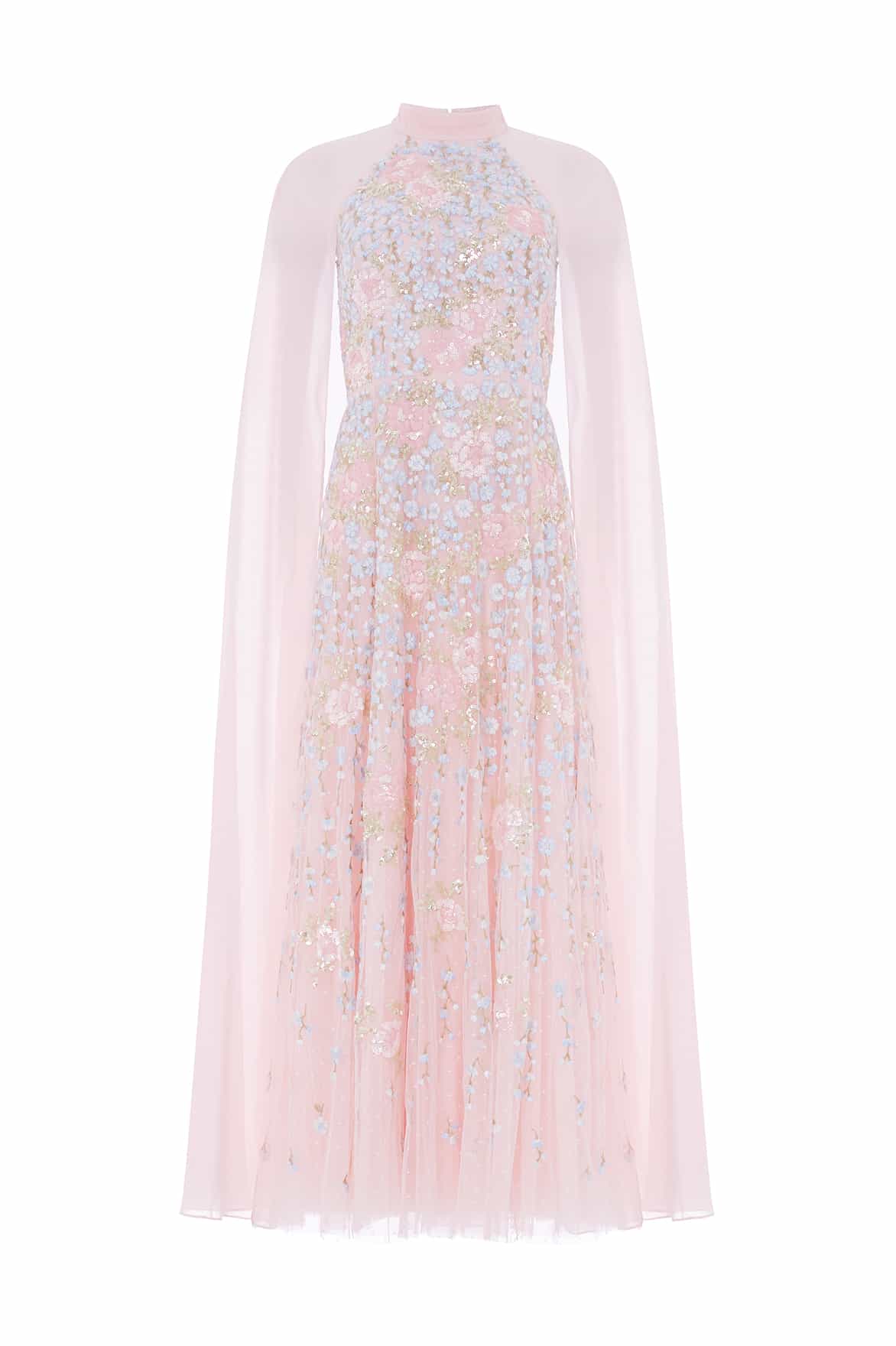 NEW SEASON. The Cressida Floral Cape Ankle Gown in Seashell/Multi. Features exquisite embroidered blooms and a delicate chiffon cape. Designed with raglan seams and soft movement through the skirt, this gown evokes ethereal romance and graceful sophistication.