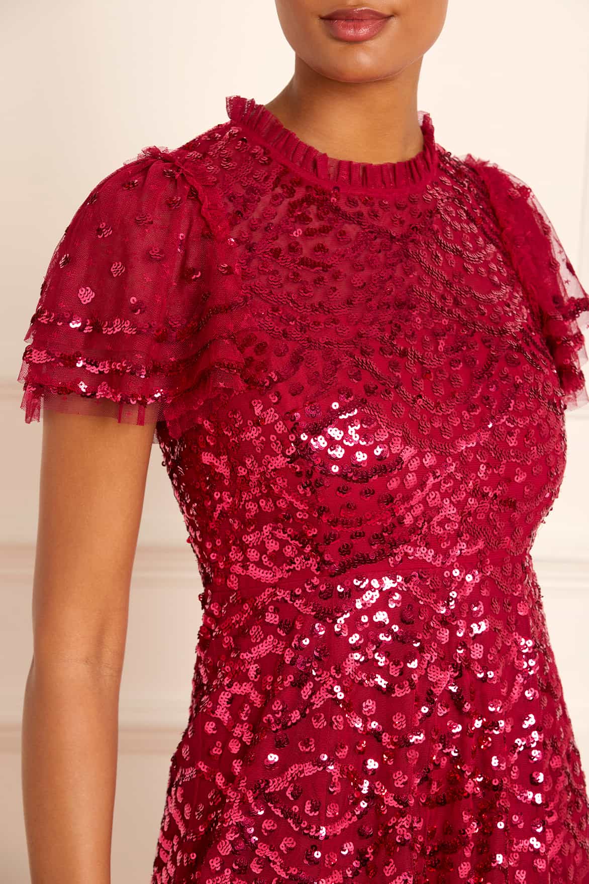 The Deco Dot Ankle Gown in Red. This style has an artwork inspired by 1930’s art deco styling. Developed with layered tulle sleeves and a sequin border edge for 1930’s romantic styling. The perfect gown for an upcoming special occasion.