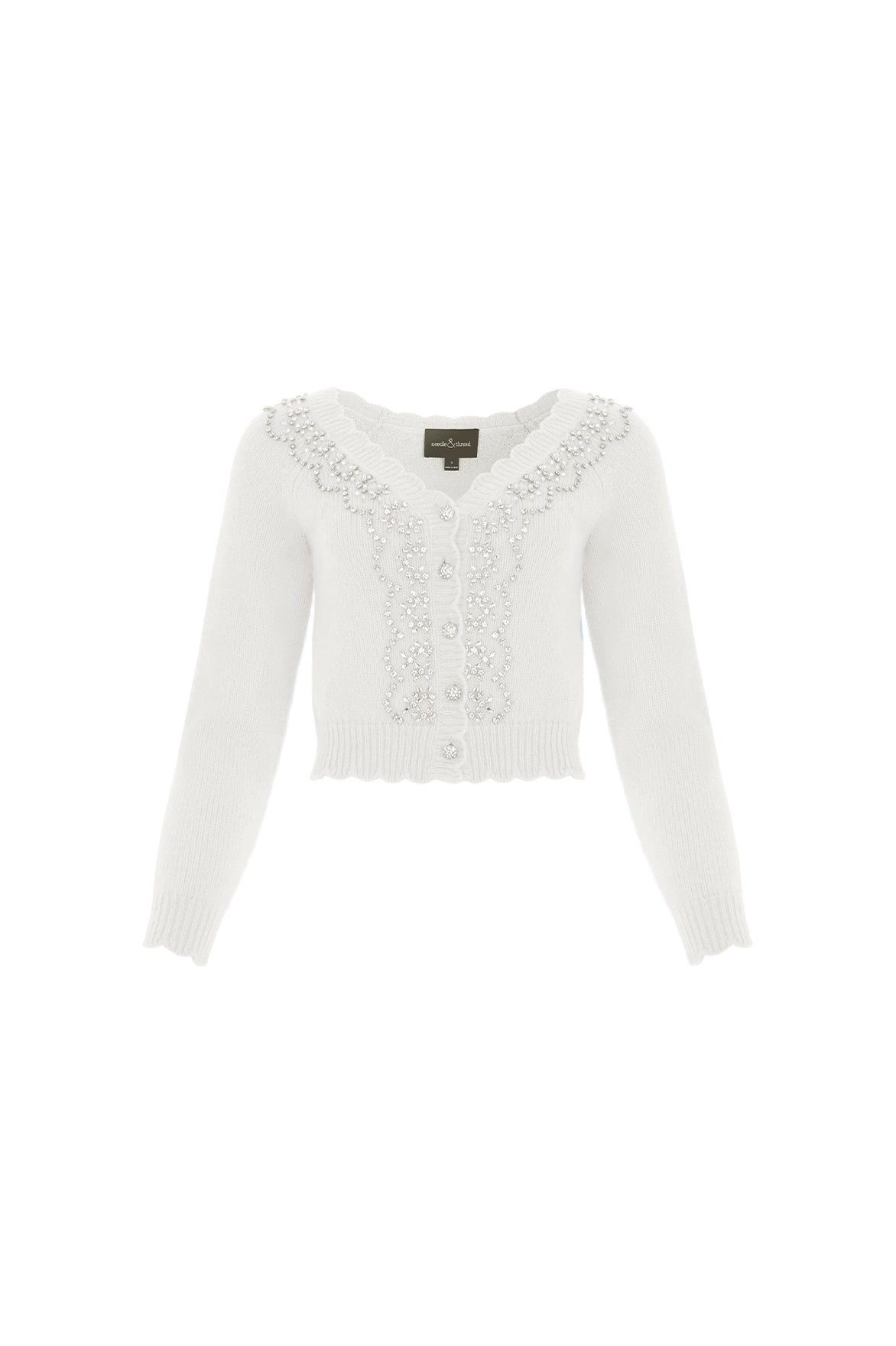 NEW SEASON | NEEDLE & THREAD EXCLUSIVE. The Embellished V-Neck Short Cardigan in Cream. Thoughtfully crafted with intricate embellishment, this piece exudes understated elegance. Designed with a flattering V-neck and a softly contoured fit, it adds subtle texture and a graceful shimmer to your look.
