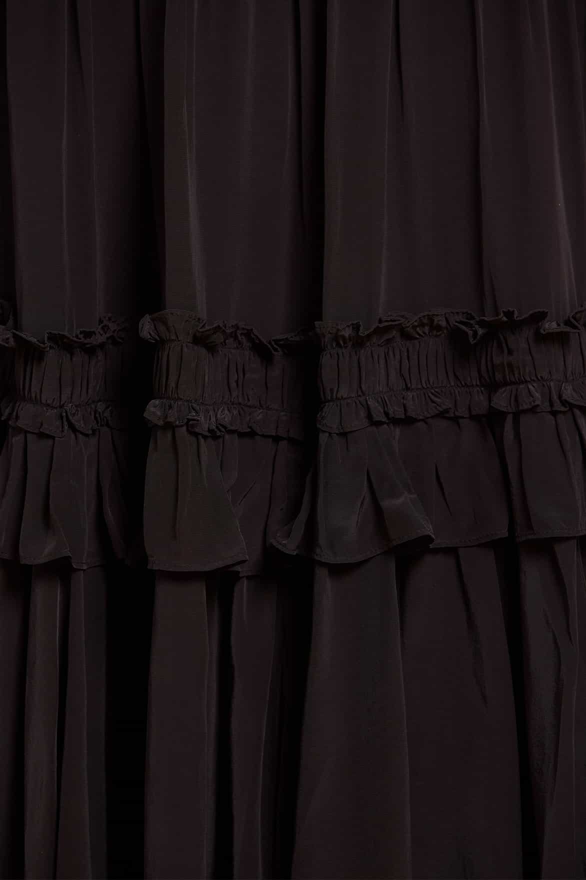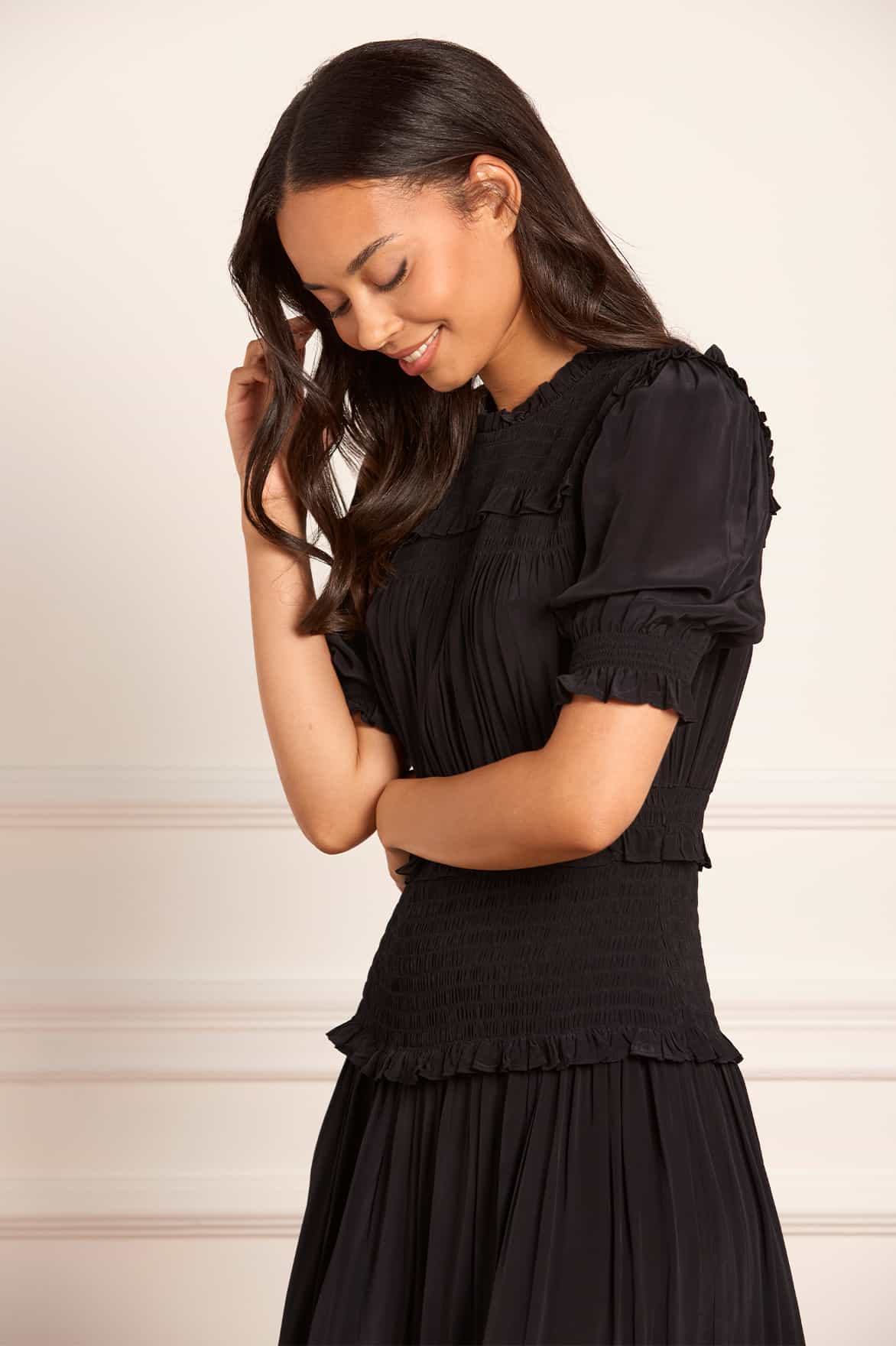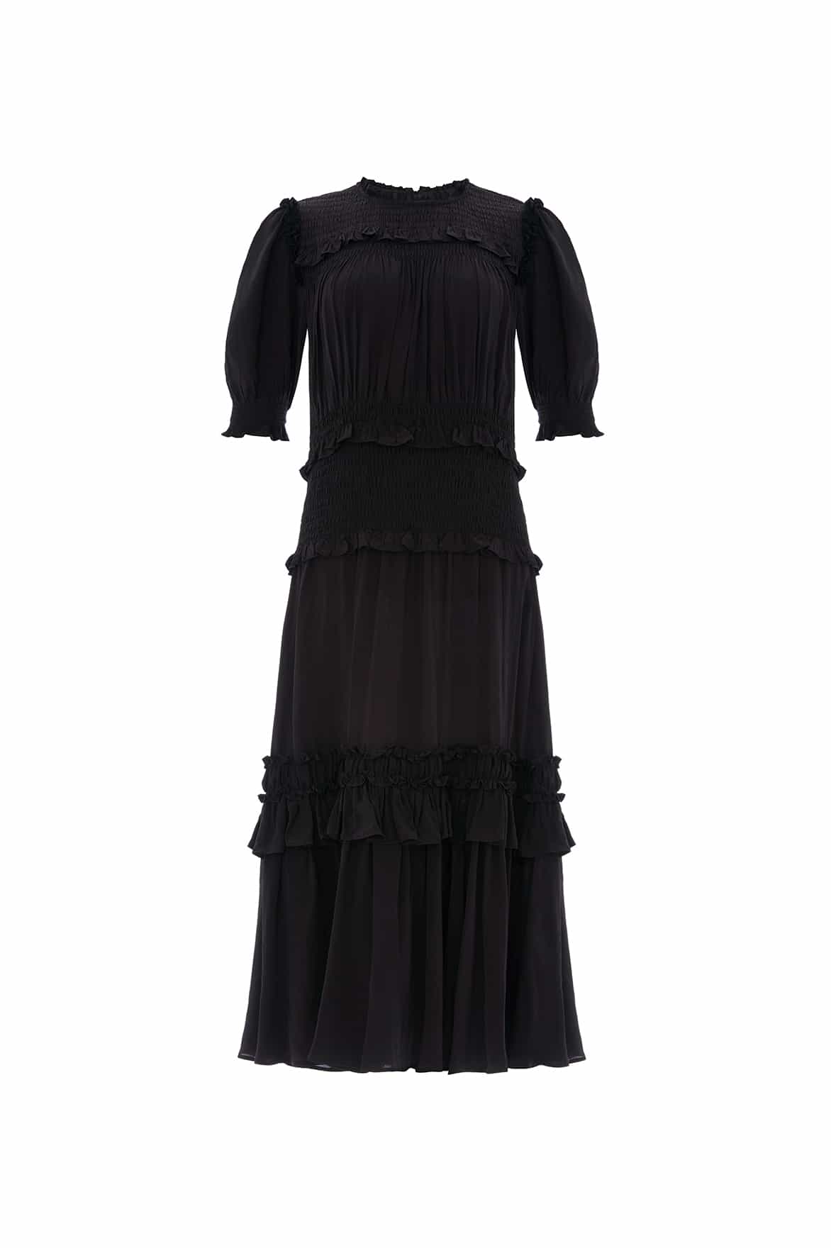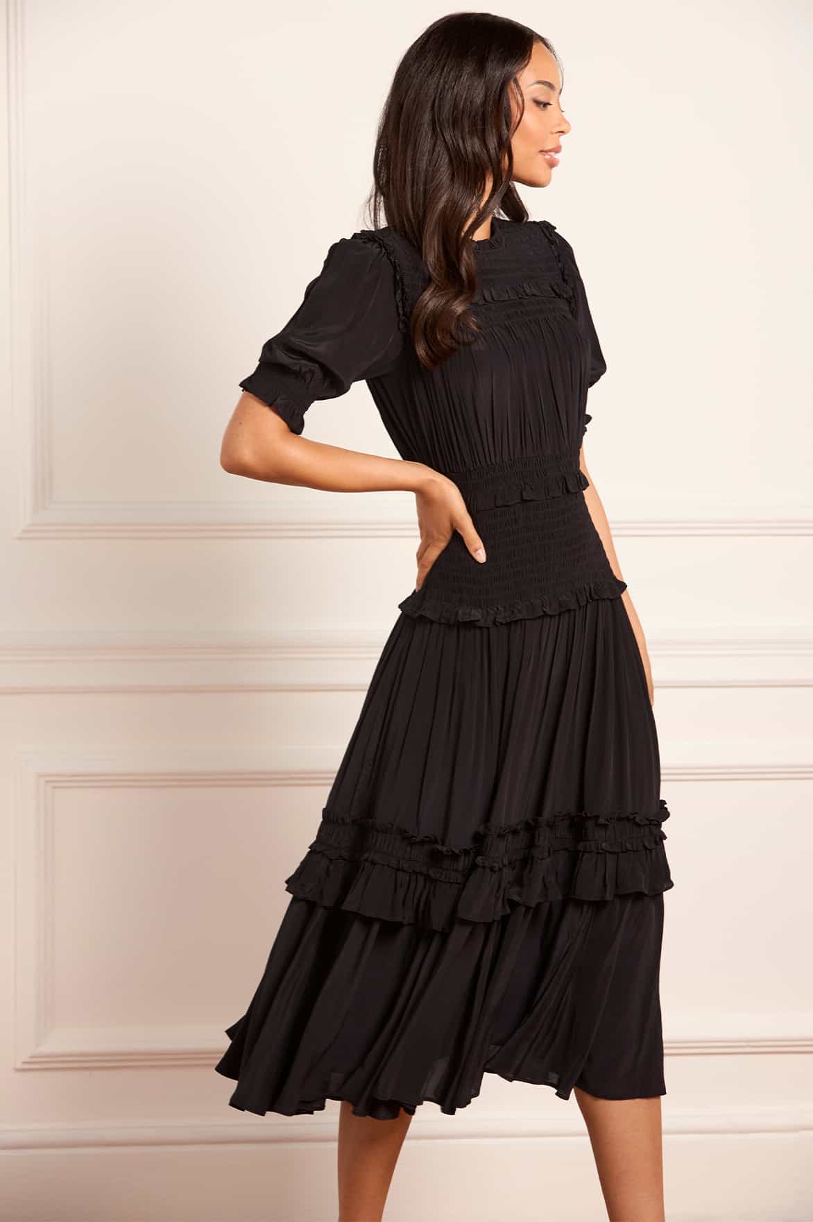 NEW SEASON | NEEDLE & THREAD EXCLUSIVE. The Emilia Crepe Ballerina Dress in Graphite. A versatile mid-length silhouette crafted in a soft matte crepe. This style features a gently fitted waist, soft draping at the neckline, and a flowing skirt for ease and movement. Perfect for sophisticated dressing or minimalist eveningwear.