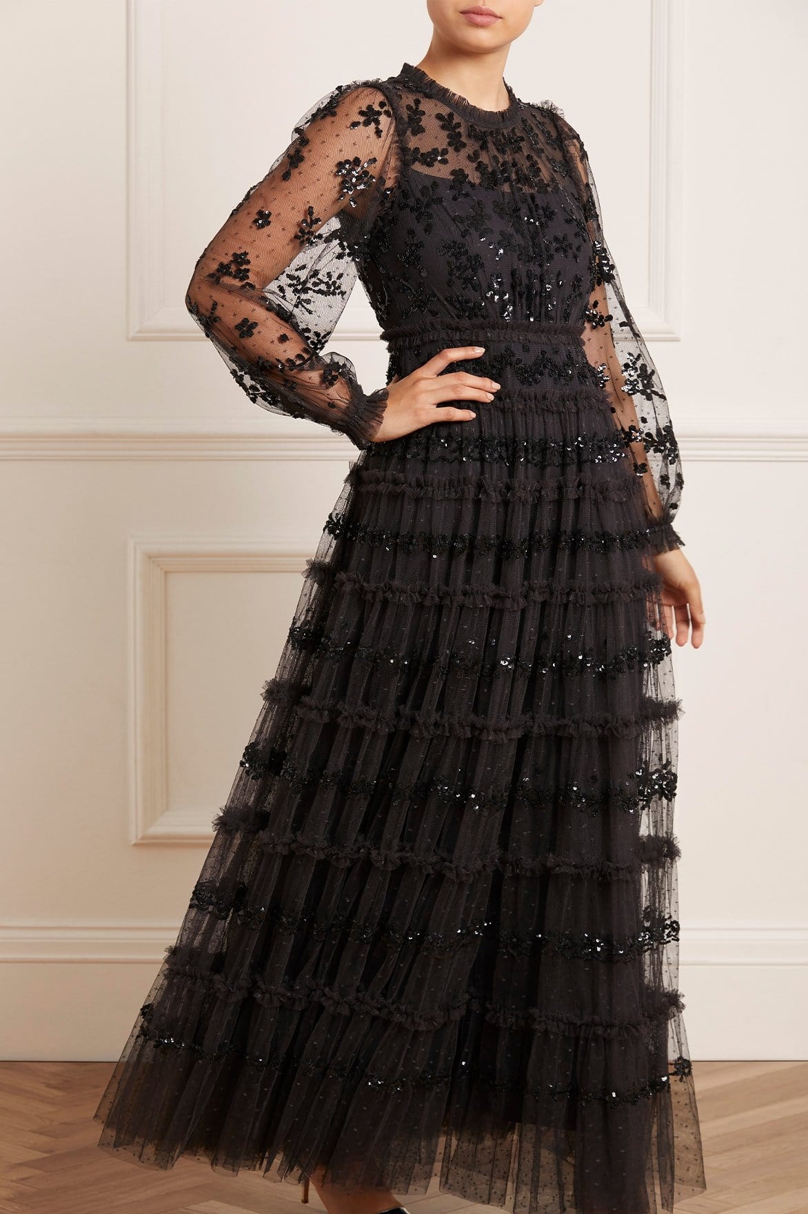 The Eve Sequin Gown in Graphite. This gown is romantically designed with a flattering, gently gathered bodice and full sleeves. Crafted with layers of our signature kisses tulle, and intricately adorned with shimmering sequin borders in pretty, lace-inspired designs. Make a statement in the Eve this season.