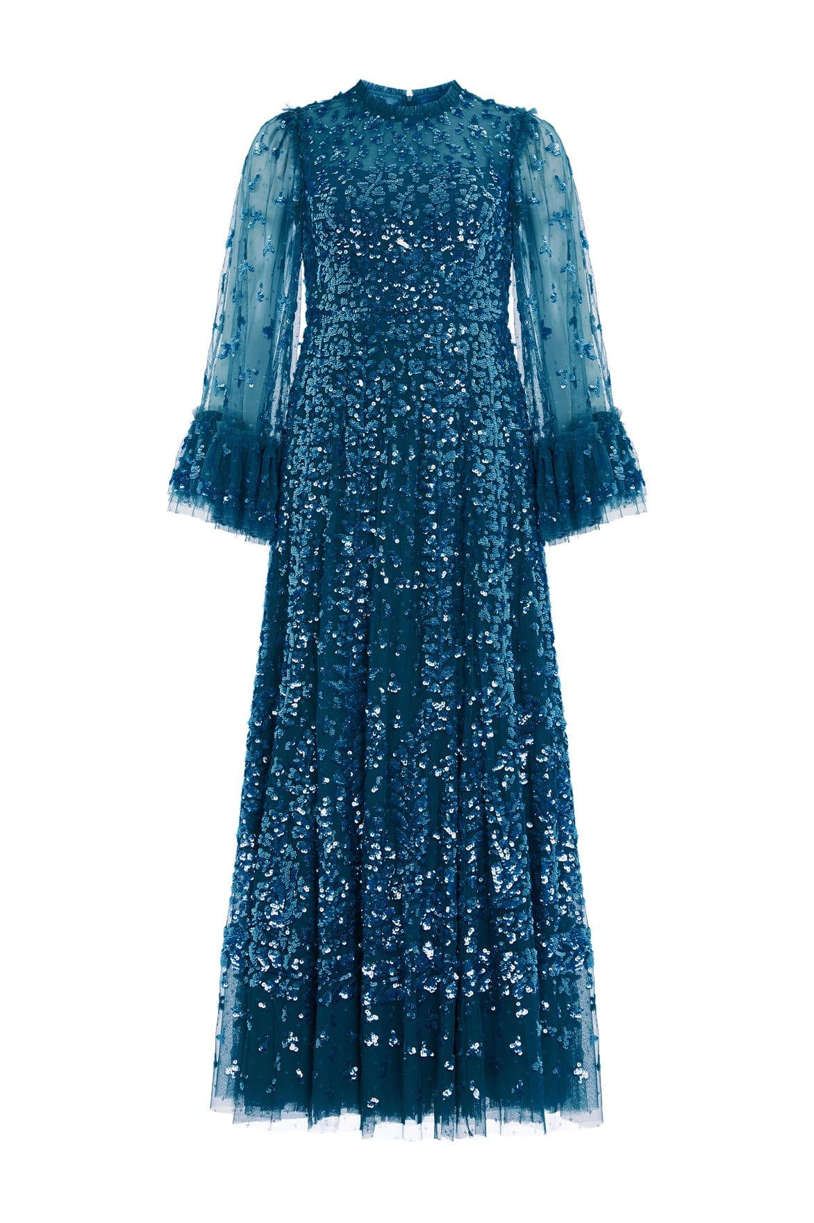 The Fern Ankle Gown in Jewel Blue. Inspired by a historical archive artwork, this gown features a shimmering statement sequin border on the skirt hem with a trailing glittering motif design that disperses towards the dress. Crafted in soft tulle with signature Needle & Thread frills, this luxurious style boasts voluminous sleeves with embellished motifs and romantic frills at the cuffs, adorned with glistening sequins. The sequins have a special high-shine gloss finish created by extra foil coating. The skirt is generously made up of layers of soft, delicate tulle and net. A classic and contemporary style.