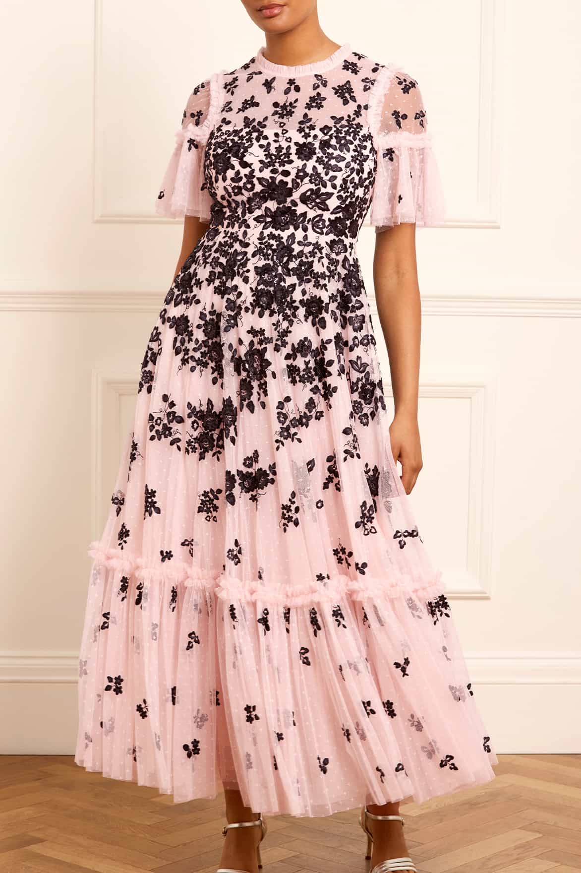 The Fluttering Flowers Ankle Gown in Dusk Pink/Black. This romantic floral artwork depicts clusters of trailing floral motifs embroidered in striking contrast thread and scattered with shimmering sequins. The gown features a layered sleeve with signature Needle & Thread tulle frills, adding a touch of elegance. The skirt is crafted from layers of soft tulle and net for a flattering fit, and the softly gathered romantic hem tier is trimmed with a ruffle, creating a beautiful and romantic statement style.