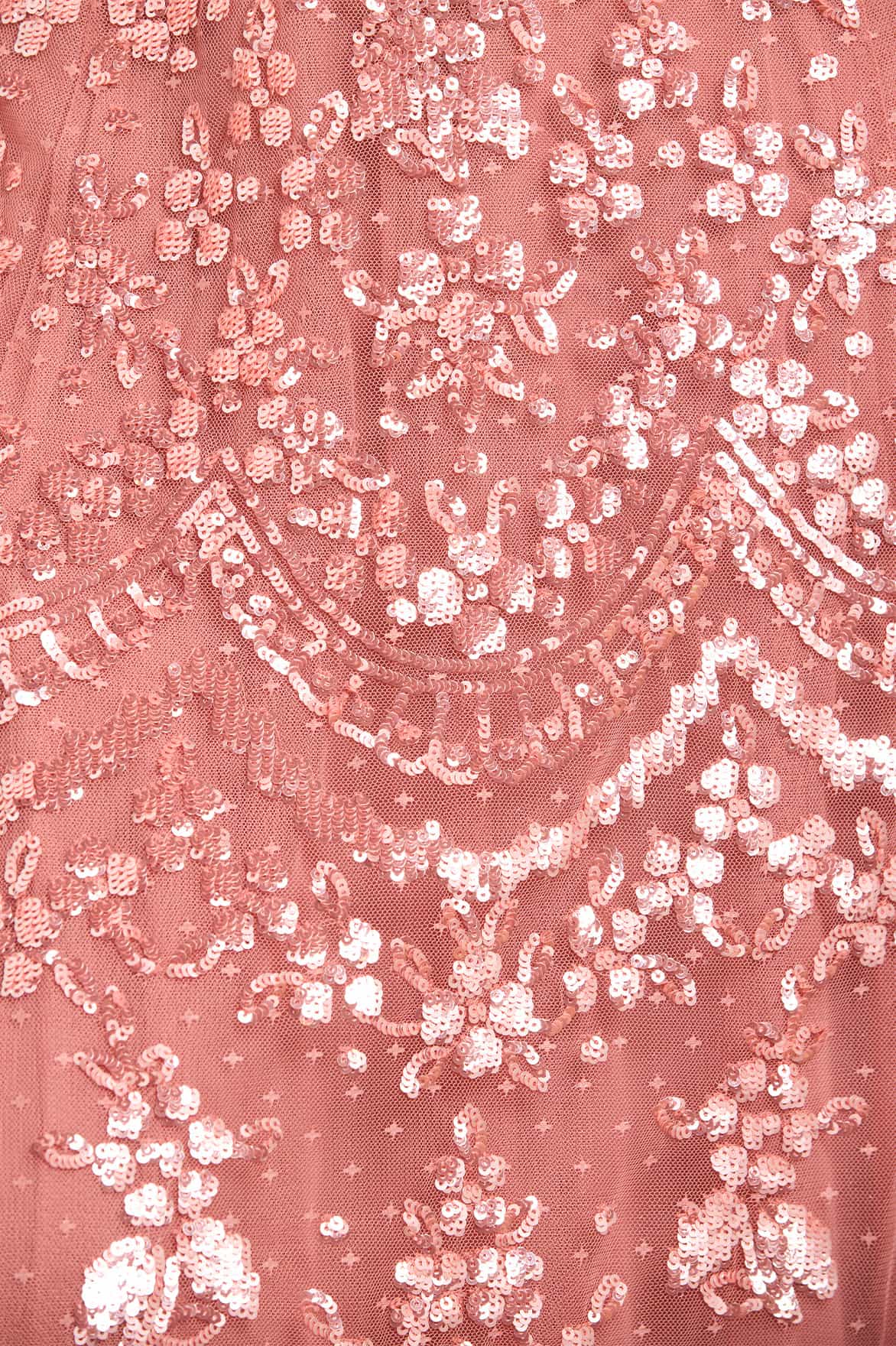 NEW SEASON. The Freya Cape Ankle Gown in Misty Rose. Exquisite Freya embellishment inspired by antique lacework adorns this romantic cape gown. Tiny high-gloss sequins and intricate scalloped borders create a flattering silhouette that softly fades towards the hem. The flowing ankle-length shape offers graceful movement for luxury evening wear.