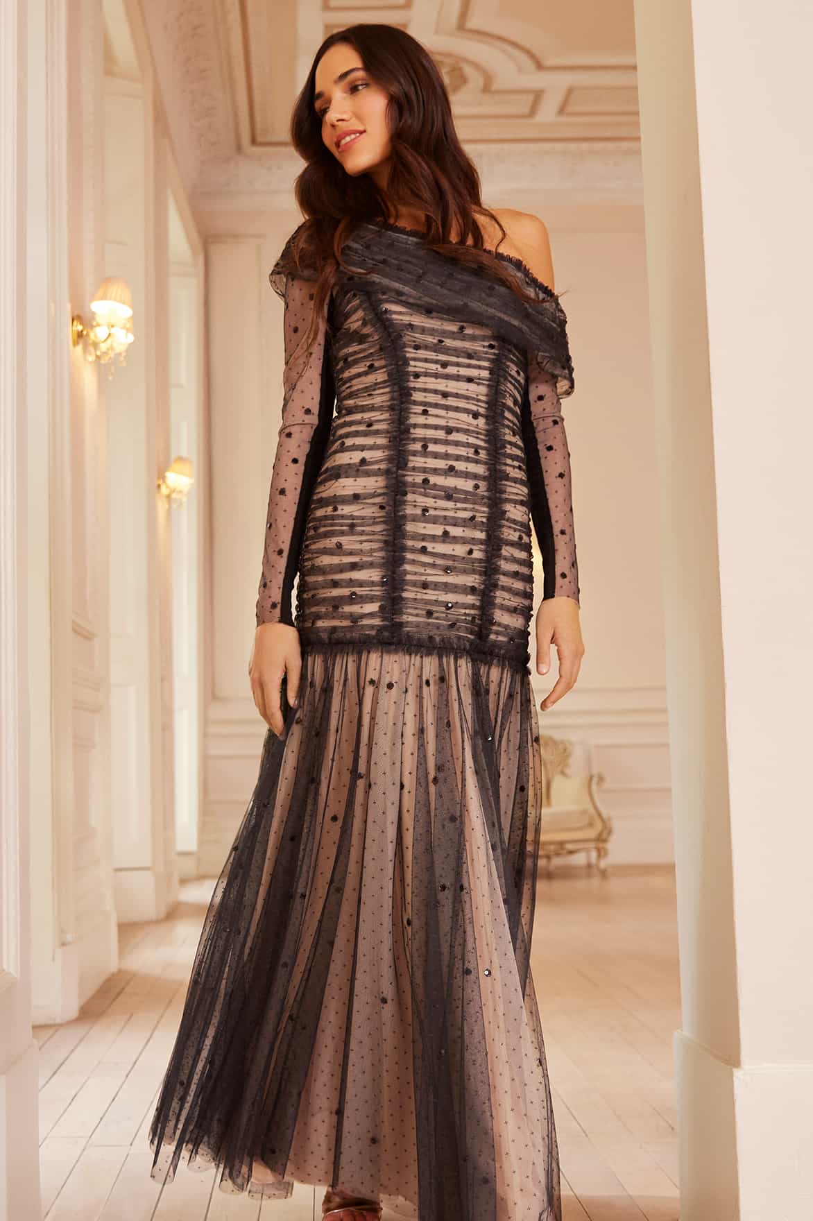 The Gigi Dot One-Shoulder Rouched Gown in Graphite/Beige. A refined take on modern draping, featuring dotted tulle with ruching through the body and a one-shoulder neckline, this gown elongates and flatters. Add a touch of romance to a sophisticated look.