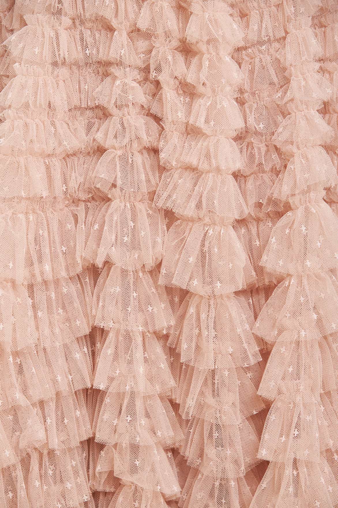 The Hattie Ruffle Skirt in Pebble. This textile skirt is engineered with layers of soft tulle and net to create a signature Needle & Thread style. Crafted with individual ruffles to create a beautiful, frilly texture. Designed with a sweeping hemline and finished at the waist with a satin ribbon for extra detail. We recommend pairing this skirt with our knitwear for a romantic Needle & Thread look.