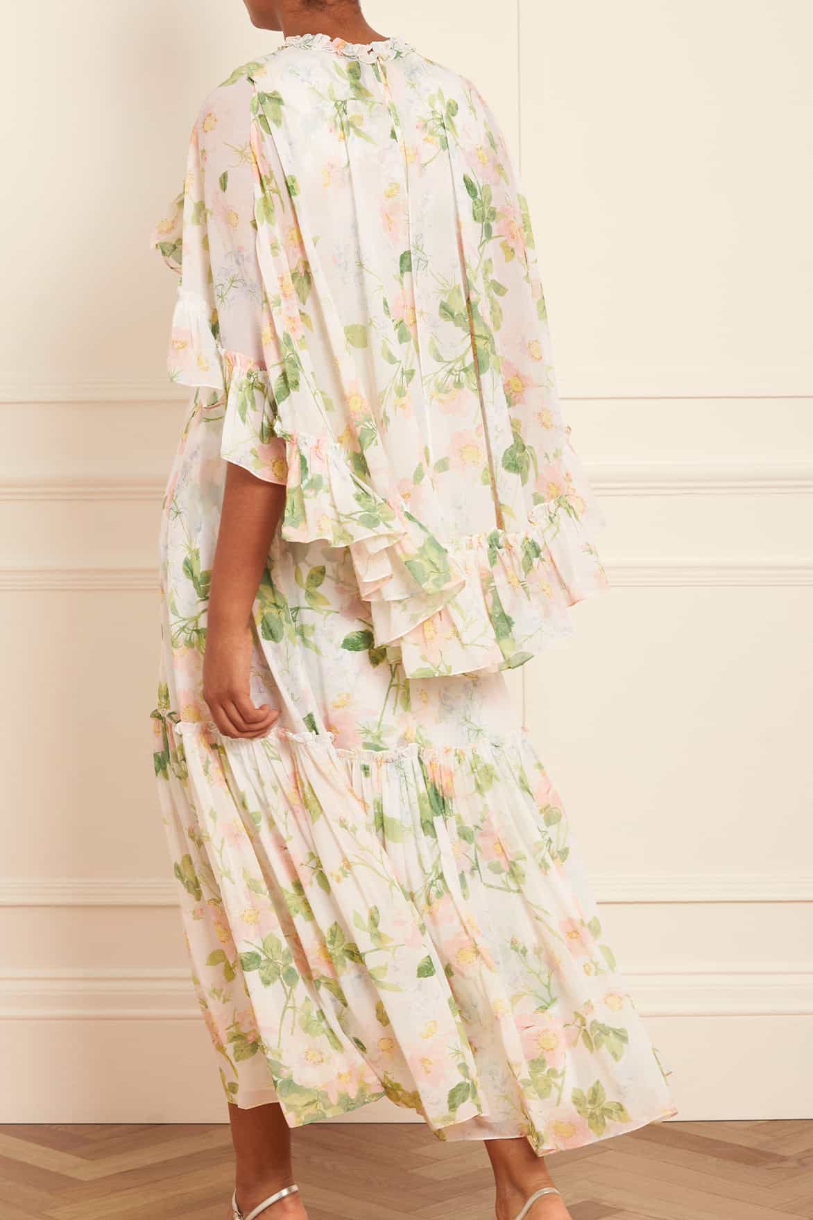 The Immortal Rose Harper Chiffon Cape Ankle Gown in Moonshine. This beautiful gown features a romantic print captured from an antique, hand-painted artwork from the early 1900s. Decorated with wild rose motifs in soft pink shades intertwined with green foliage. This gown features a dramatic yet elegant cape which has a detachable fastening for versatile styling. Developed in the softest chiffon for a romantic flowing silhouette. The perfect gown to take you from day to night.