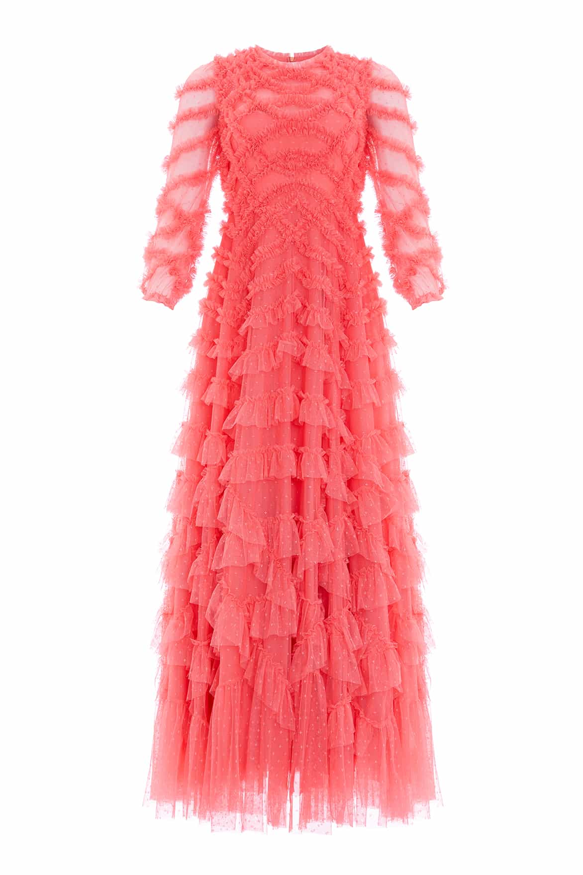 The Lana Round Neck Gown in Pink Sky. This beautiful gown is adorned and engineered with tulle frills to create a romantic textile. Developed with a round neck design and long sleeve for an elegant look. Beautifully crafted with layers of soft tulle for a whimsical, statement texture. Expect all eyes on you in this magical Needle & Thread piece.