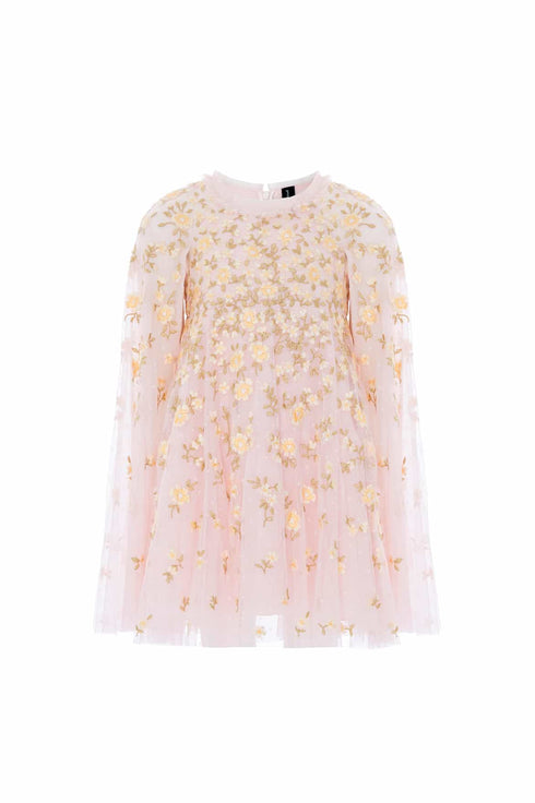 NEW SEASON. The Lea Ditsy Cape Kids Dress in Peony Pink/Lemon Sorbet. This enchanting kids dress features a flowing cape detail and a multi-layered skirt that moves beautifully. Finished with delicate ditsy florals inspired by painted garden scenes, it’s both comfortable and luxurious. Thoughtfully designed to complement the coordinating Lea Ditsy styles in the women’s collection.