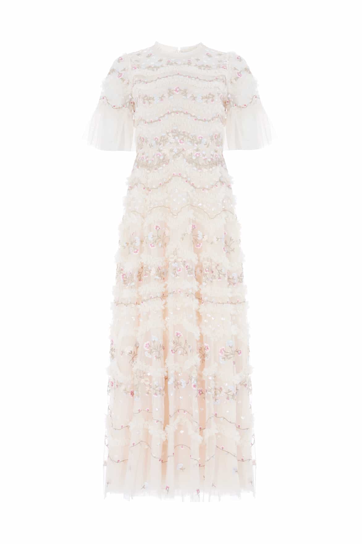 NEW SEASON. The Marina Ruffle Ankle Gown in Cream/Multi showcases delicate floral embroidery intertwined with soft frill detailing. Crafted from layers of tulle, this gown moves beautifully, capturing the spirit of feminine grace.