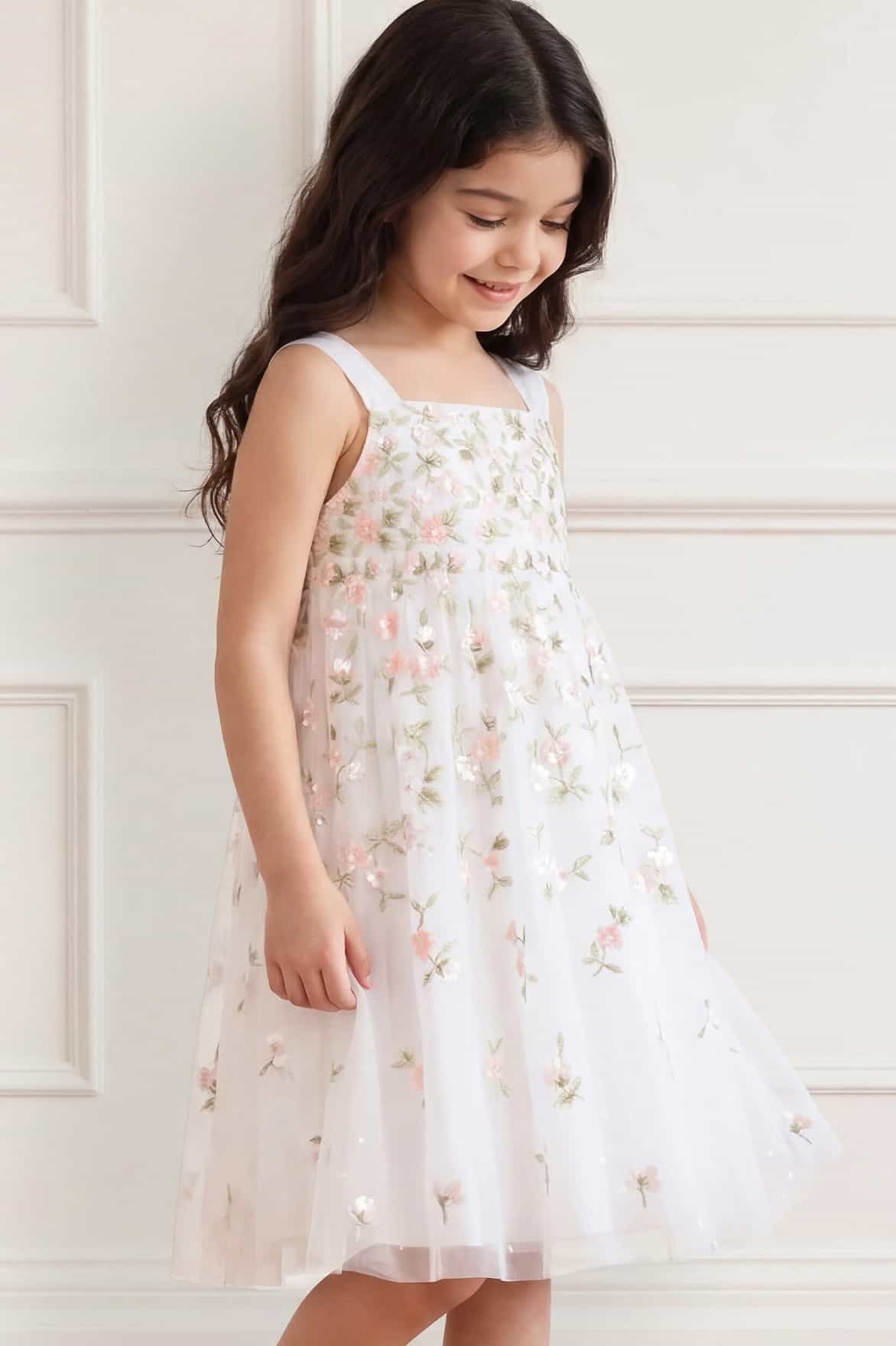NEW SEASON | NEEDLE & THREAD EXCLUSIVE. The Meadow Ditsy Kids Dress in Swan White/Peach. Adorned with romantic florals highlighted with gentle shimmer, this kids dress offers a graceful and feminine silhouette. The softly layered skirt creates effortless movement with every step. A timeless special occasion piece, designed to sit alongside the Meadow Ditsy Cami Gown.