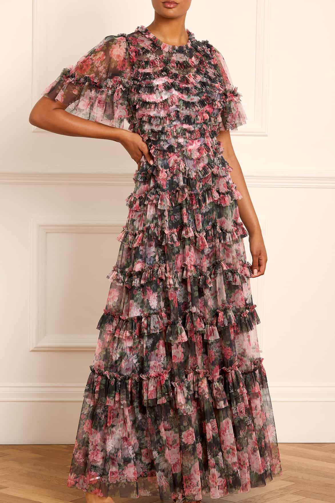 The Midnight Dance Round Neck Gown in Graphite. Beautifully printed with a floral design featuring luxurious blooms taken from archive, hand-painted artwork from the early 1900s. This style features pretty, engineered ruffle details perfectly positioned and inspired by Victorian styling. Crafted in signature Needle & Thread soft tulle for a romantic look. The skirt has a flattering fit that skims the body and gently increases in fullness, creating stunning movement within the tulle.