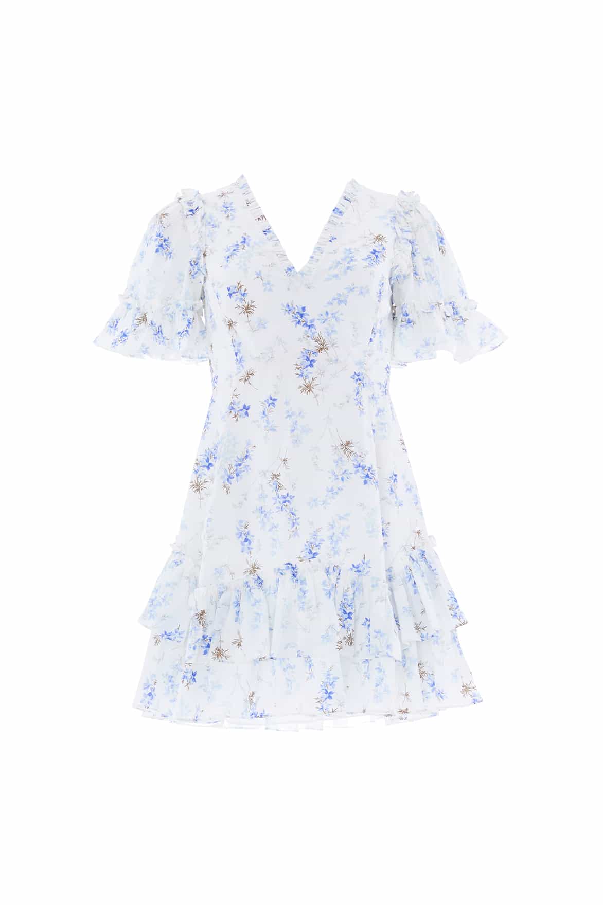 The Ophelia Ditsy Eva Crepe Micro Mini Dress in Moonshine/Blue. This dress features a beautiful, romantic trailing print taken from an archive, hand-painted artwork from the early 1900s, depicting soft, whimsical ditsy floating florals. Inspired by 1930s tea dresses, it is adorned with elegant frills and offers an effortless, flattering fit with a V-shaped waist seam. The romantic fluted sleeves are detailed with frills, making this dress perfect for any occasion. The perfect piece to take you from day to night.