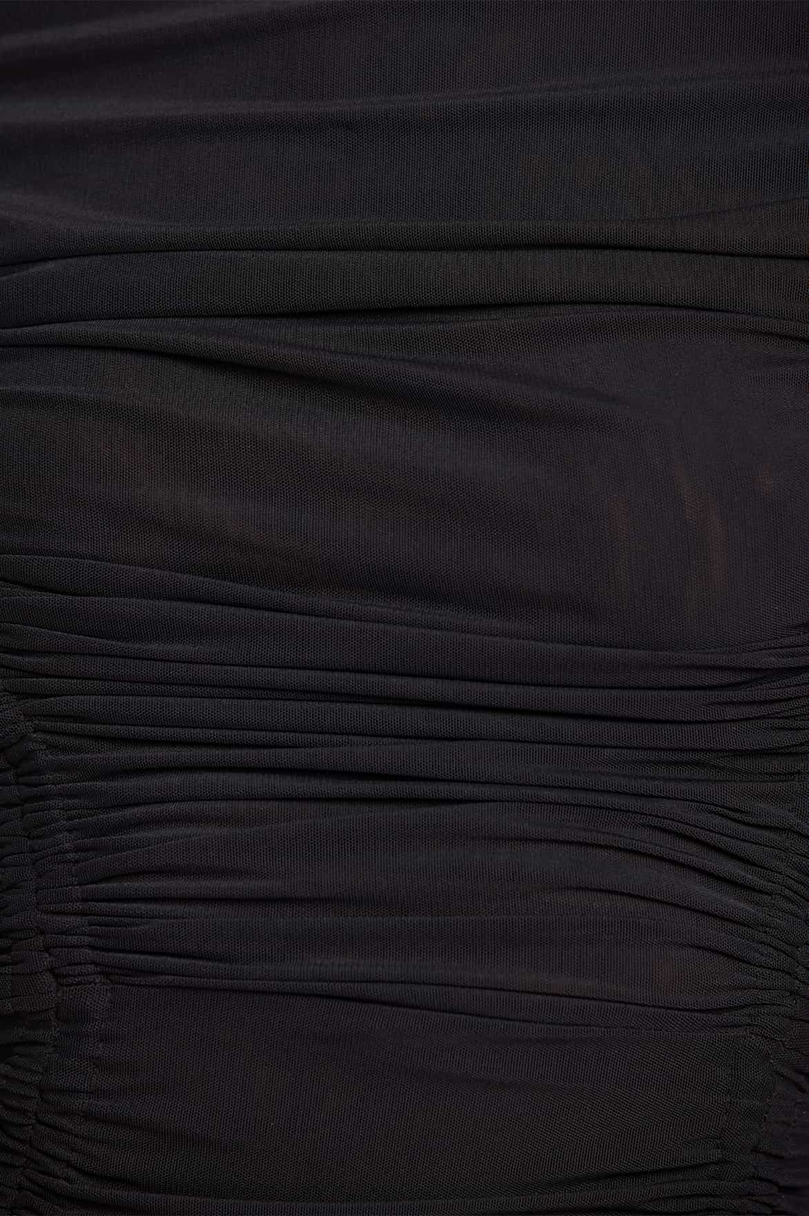 NEW SEASON. The Phoebe Turtleneck Micro Mini Dress in Jet Black. Crafted in soft stretch tulle, this slim silhouette features a high turtleneck and sheer long sleeves for a refined yet modern look. The micro mini length adds playful energy, balancing with the classic silhouette of this party dress. The jet black palette recalls moonlit skies, making this a chic and versatile piece.