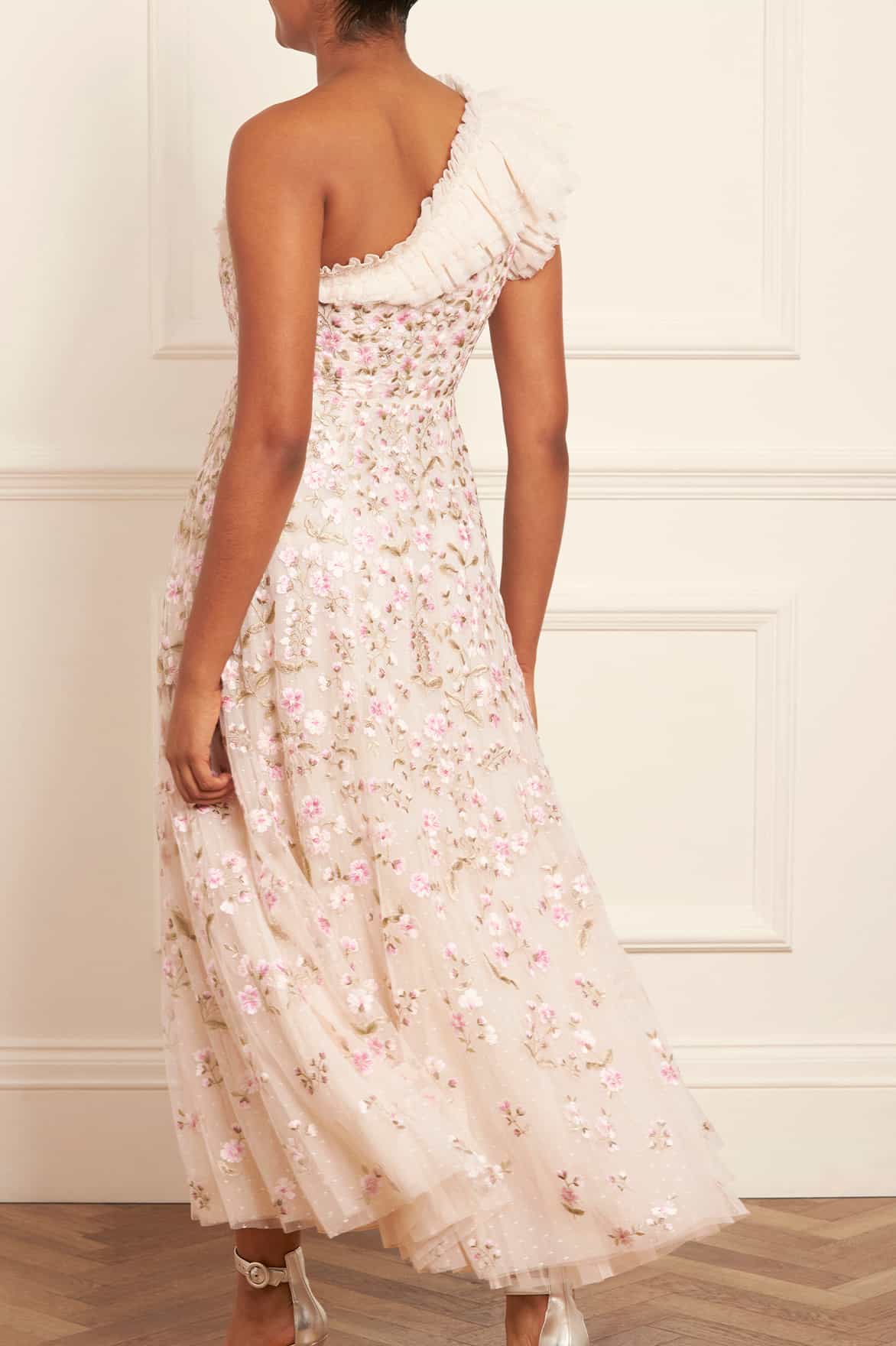 The Posy Pirouette One-Shoulder Ankle Gown in Cream / Pink. A statement style for the season ahead. This gown is beautifully embroidered with intricate, rich posy florals scattered all-over and dispersing towards the hem. Developed with a one-shoulder design and adorned with soft, tulle ruffles adding a romantic finish. Crafted with a net tulle generous skirt with a sweeping hemline. A traditional yet stylish gown.