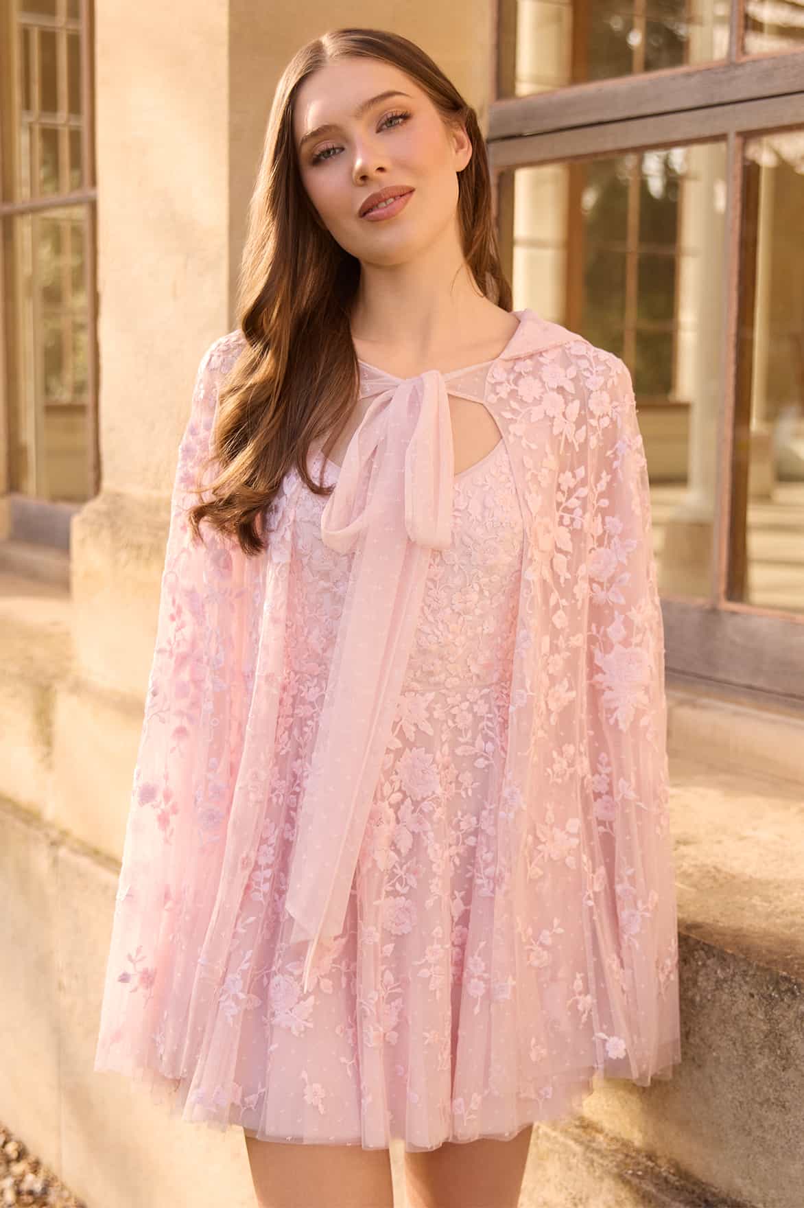 NEW SEASON | NEEDLE & THREAD EXCLUSIVE. The Rosa Hooded Cape in Peony Pink. Inspired by signature floral embroidery, the Rosa Hooded Cape offers a romantic layering piece with an ethereal feel. Designed with soft drape and delicate detailing, it adds a dramatic yet refined finish to occasionwear looks.