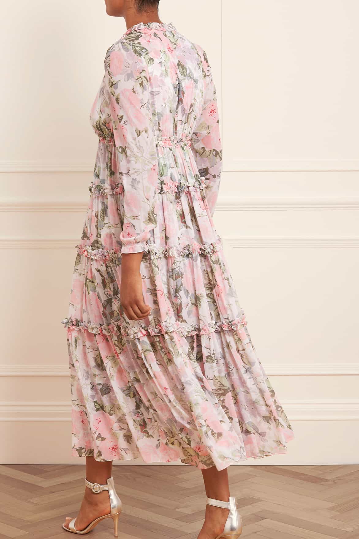 The Rose Powder Chiffon Ankle Gown in Moonshine. This gown is inspired by a 1900s hand-painted wallpaper design. Beautifully printed with florals in faded pastels for a vintage look. Developed with a soft chiffon fabric with a loose fitting silhouette for effortless styling. Designed with an upwards V-shaped waistline to create a flattering fit, gathered ruffles and skirt tiers for a signature Needle & Thread look. A versatile piece you'll forever cherish.