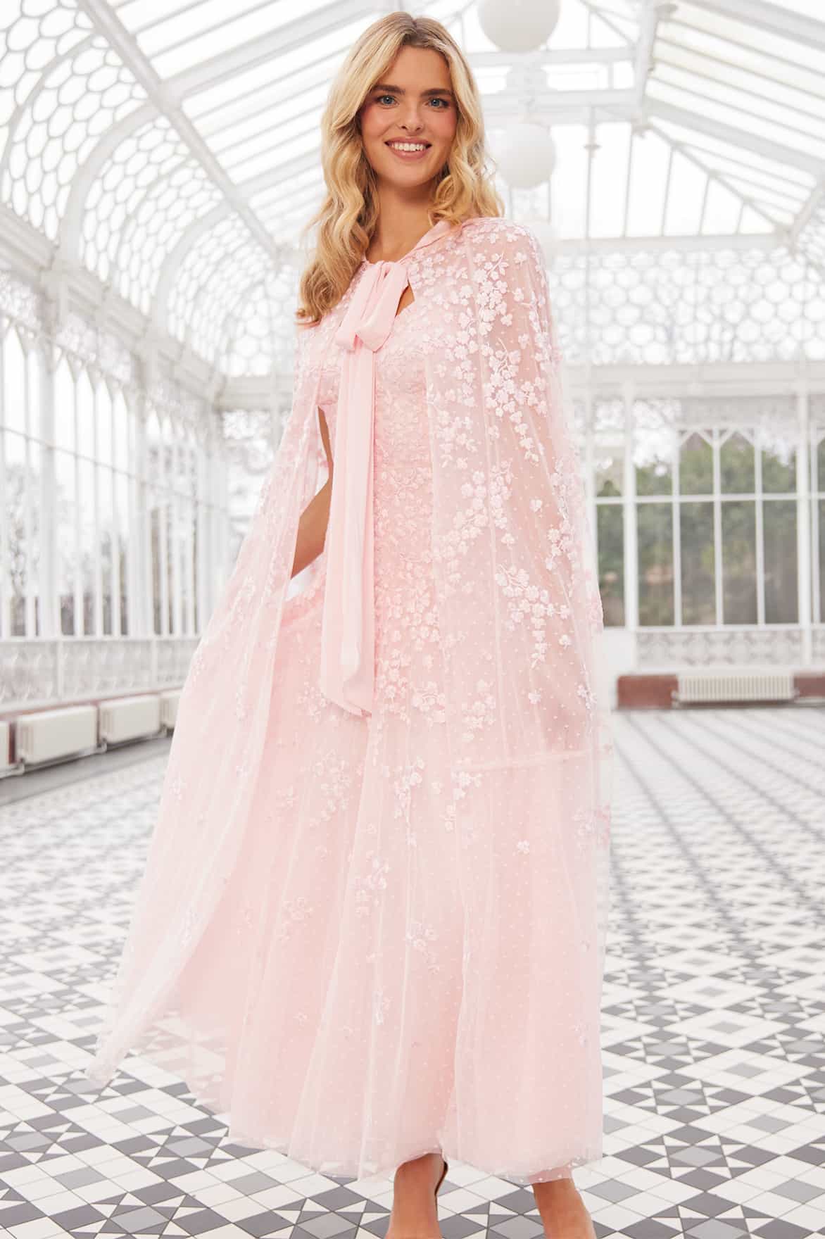 NEW SEASON | NEEDLE & THREAD EXCLUSIVE. The Scatter Blossom Hooded Long Cape in Seashell. A signature statement piece. Adorned with tonal floral embroidery and designed with a softly draped hood, this exclusive style adds ethereal charm to any look.