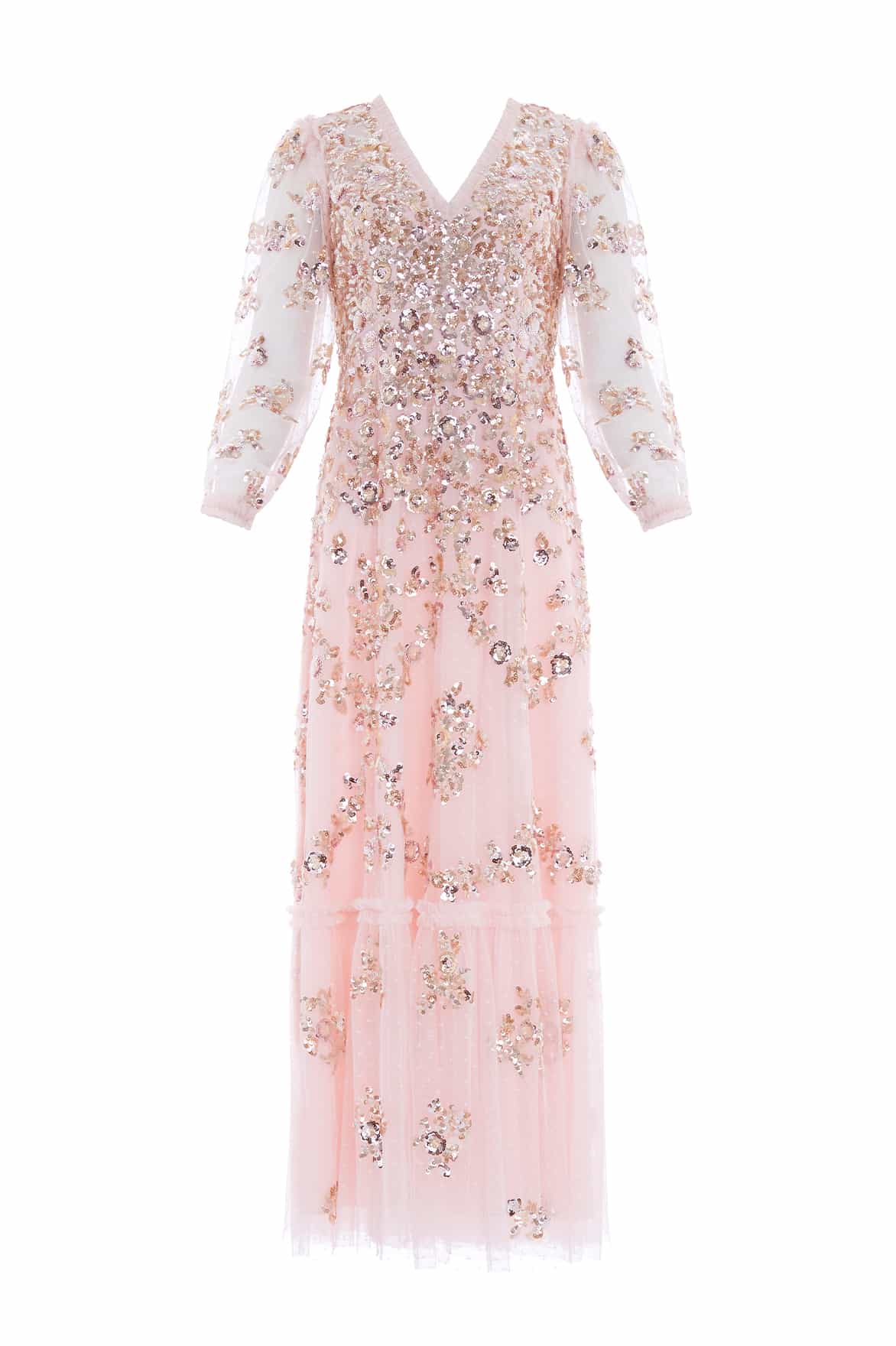 The Sequin Chain V-Neck Ankle Gown in Dusk Pink/Gold. Inspired by a vintage couture artwork and translated into an engineered design with dense delicate floral motifs across the bodice, gently cascading into floral bouquet motifs and scalloped garlands. The sequins used have a special high-shine, gloss finish created from extra foil coating added to each sequin to create this extra lustrous look. This gown features signature frills around the V neckline and blouson sleeves with an elasticated cuff for ease of wear. This slimmer, easy-to-wear silhouette features a softly gathered tulle skirt tier, trimmed with a frill, adding volume to the hemline and creating an ethereal, romantic feel.