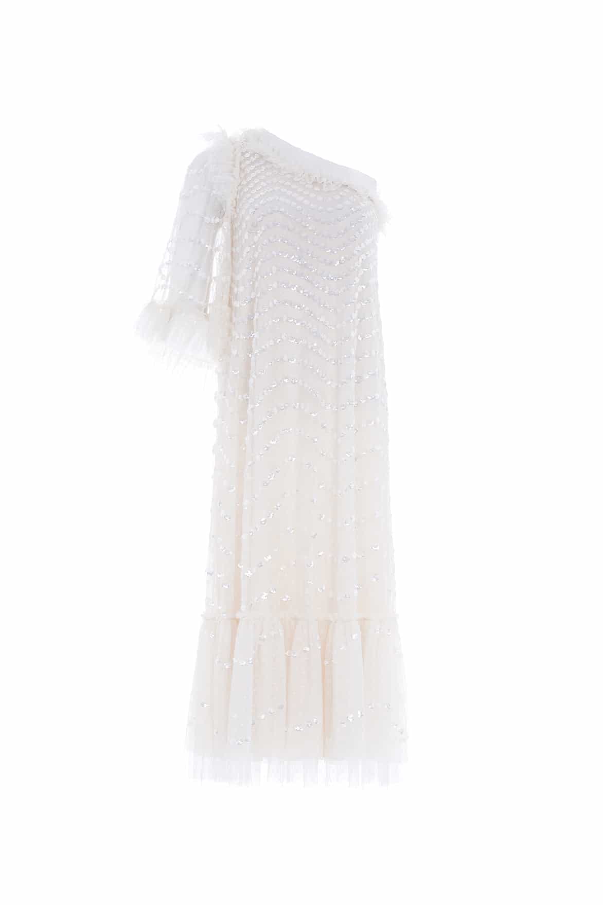 NEW SEASON | NEEDLE & THREAD EXCLUSIVE. The Shimmer Wave Gloss One-Shoulder Ballerina Dress in Cream. This ballerina dress is developed with a one-shoulder design and a generous, voluminous sleeve for elegant detail. Adorned with a shimmering artwork in high gloss sequins. This style is inspired by the sea waves of the Riveria, featuring delicate sequins creating undulating borders for a romantic, glistening effect. The skirt is made up of layers of signature Needle & Thread soft tulle. A Needle & Thread season favourite.