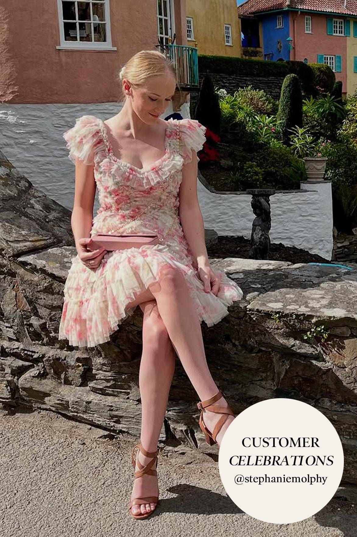 Meet the Summer Posy Lola Backless Micro Mini Dress in Moonshine / Coral. A hand-painted archive print featuring sunset and pink peonies in full bloom. This mini dress is decorated with pretty posy, floral clusters scattered and dispersed throughout to create an all-over beautiful print. Designed with signature Needle & Thread detailing featuring soft tulle, gathered frills and an engineered textile. Developed with a backless design and frothy sleeves for a playful, romantic look. Expect all eyes on you in this whimsical piece.