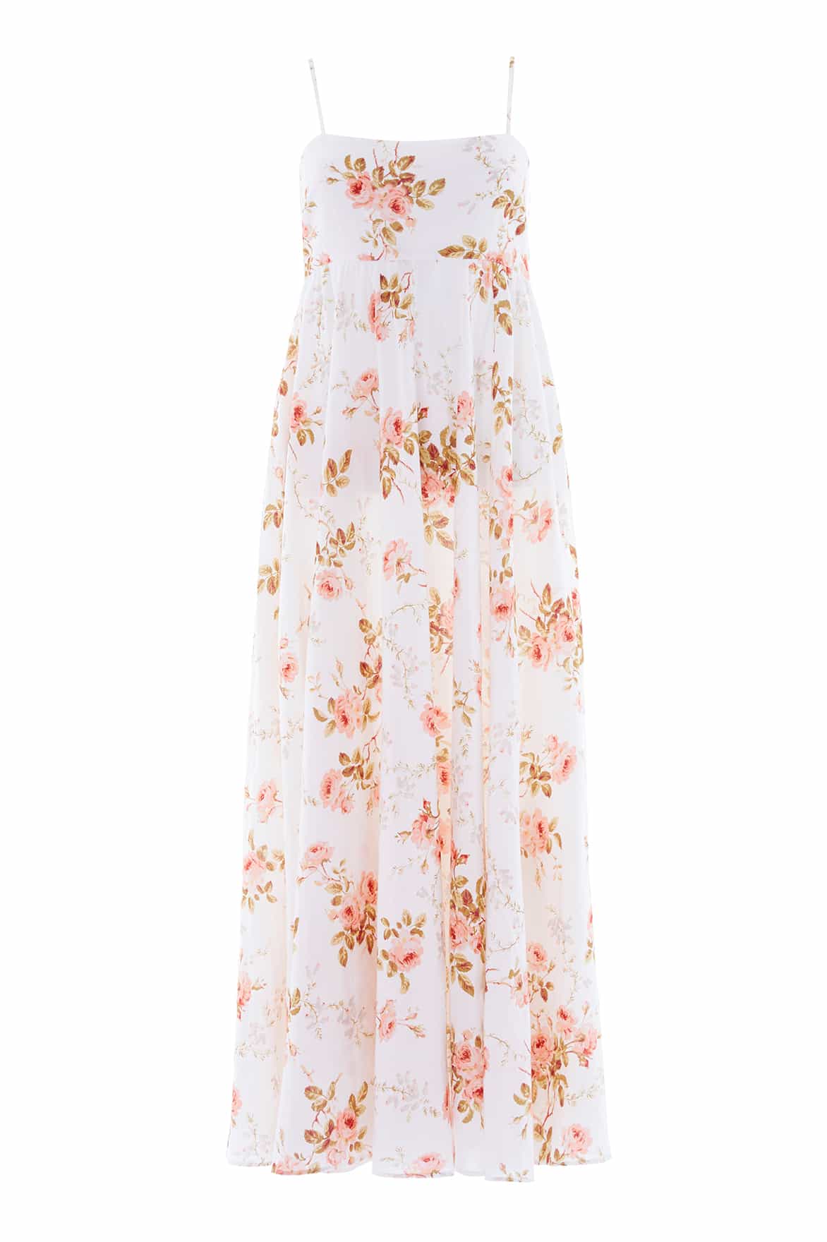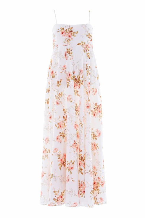 NEW SEASON | NEEDLE & THREAD EXCLUSIVE. The Summer’s Rose Linen Blend Cami Ankle Gown in White. Crafted in a breathable linen blend and featuring the delicate Summer’s Rose print, this cami ankle gown offers effortless femininity. Designed with slim camisole straps, a circle-cut skirt and a shirring panel at the back bodice for ease of wear and fit.