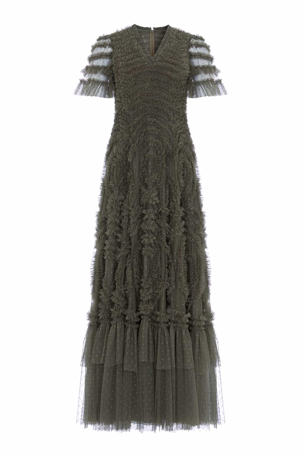 The Verity Ruffle V-Neck Gown in Juniper. A brand new colour for the season ahead. This textile piece is designed with signature Needle & Thread detailing. Beautifully developed with romantic, frothy tulle and delicate ruffles, creating a beautiful artistic effect and flattering shape. Make a statement in the Verity.