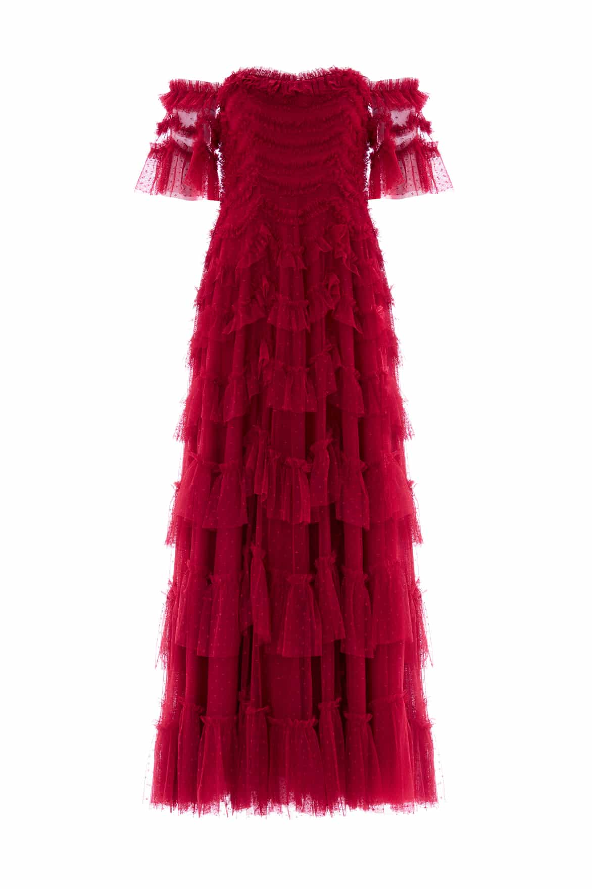 The Aviana Off-Shoulder Gown in Red. Romantic dressing is reinvented with a dramatic palette. Crafted from sculptural rows of soft tulle frills, this statement gown features scallop-tiered layers that build volume and romance. The rich red shade amplifies the gown’s drama, evoking passion and intensity.